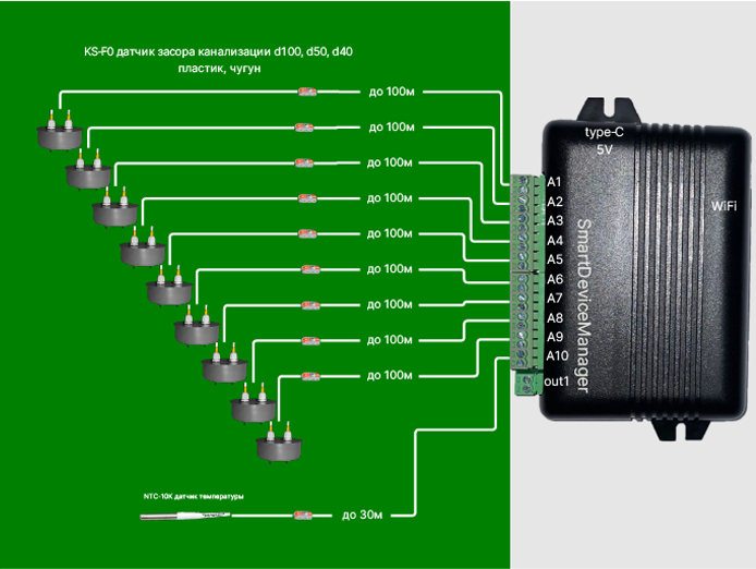 При засоре повышается уровень воды в канализационных трубах и происходит замыкание контактов электродов датчика.
