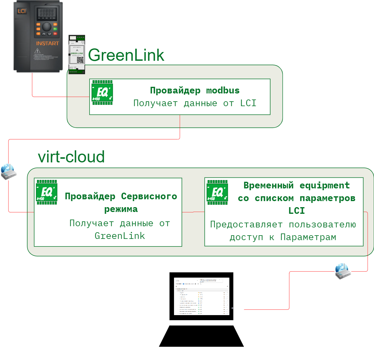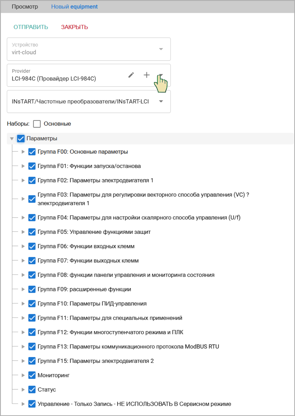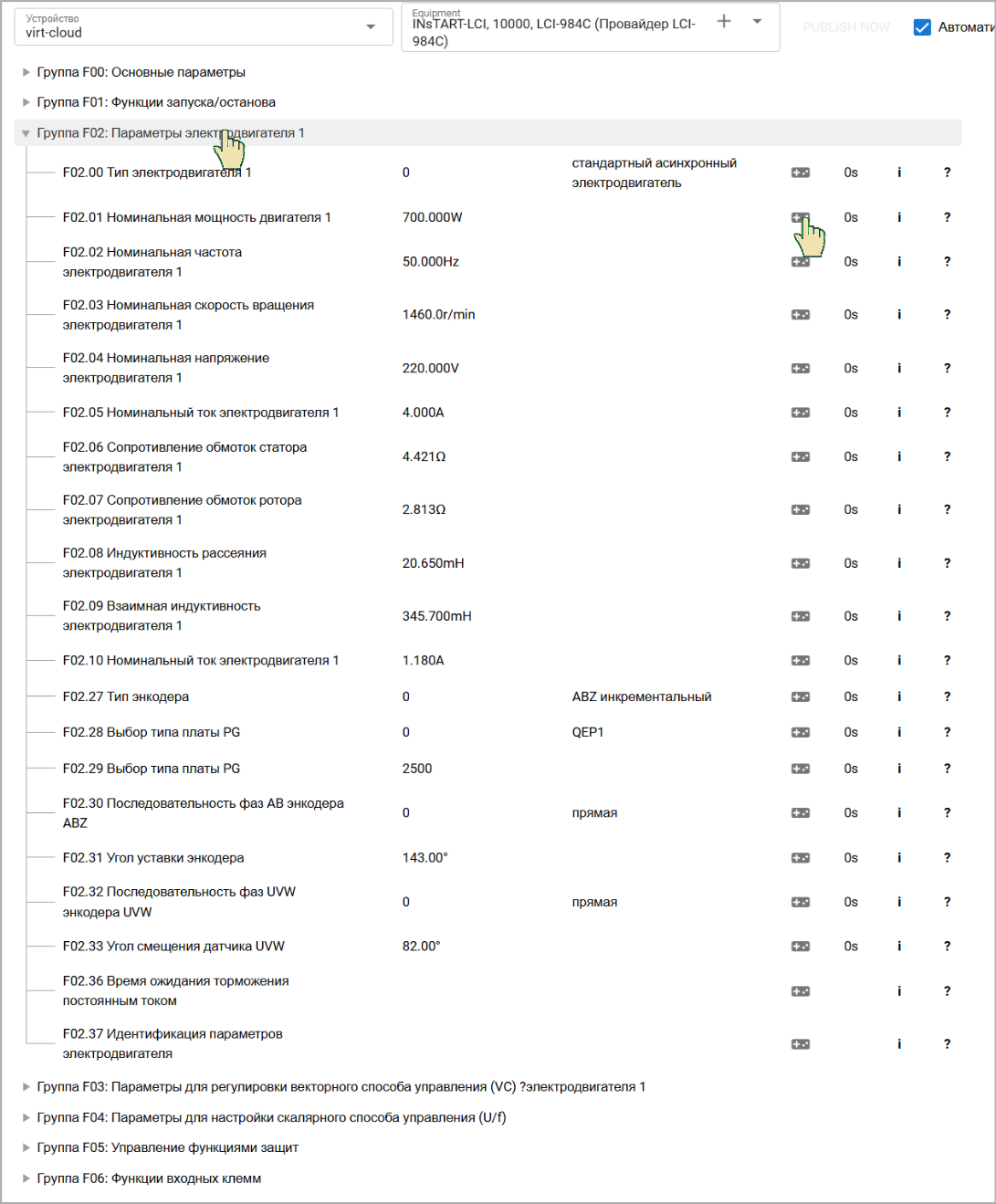 Временный equipment содержит полный список Параметров ПЧ LCI и создается на время просмотра значений Пользователем, получает данные от Провайдера Сервисного режима