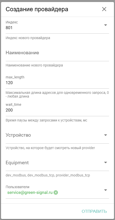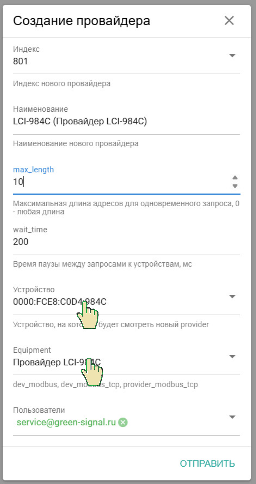 Необходимо выбрать Устройство GreenLink и Провайдера modbus
