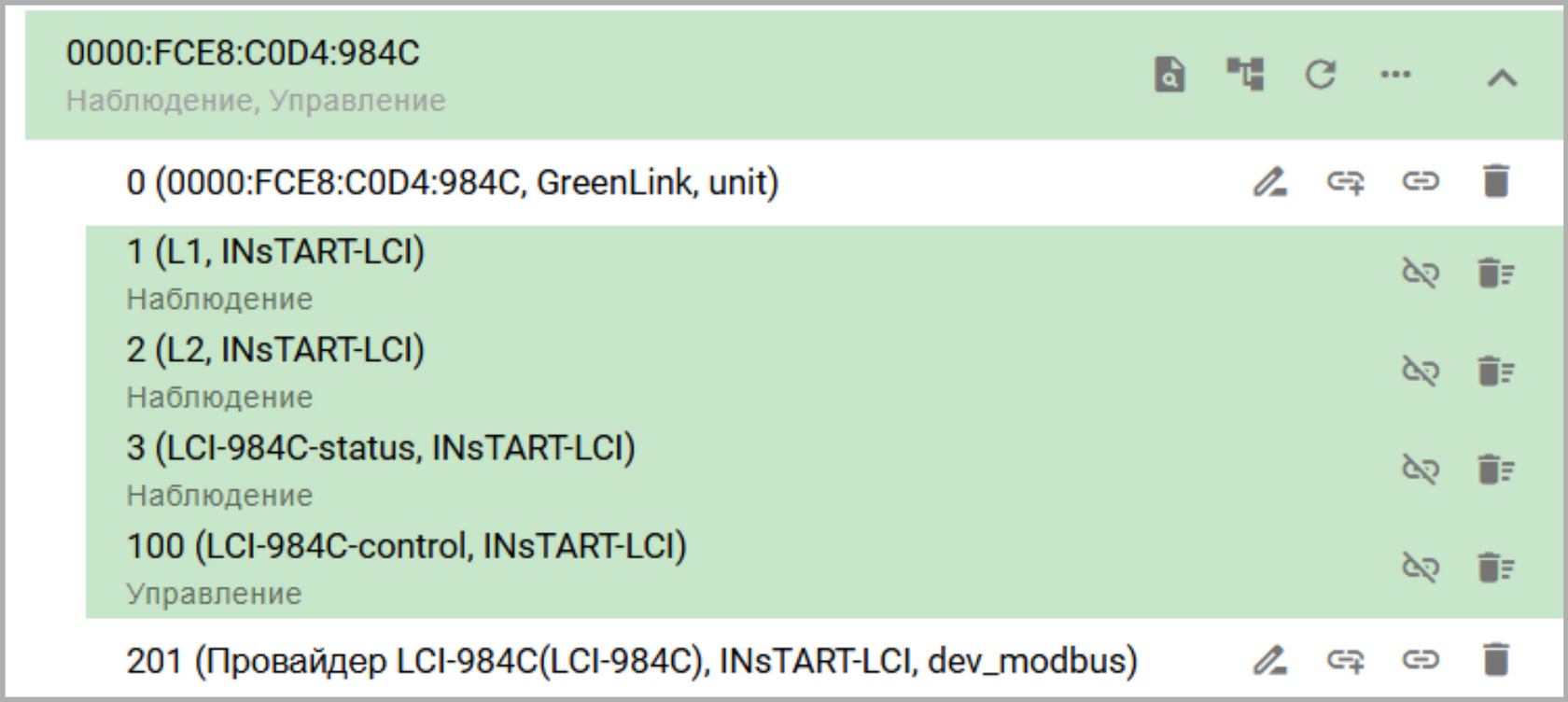 Создать на GreenLink блоки Наблюдения с Параметрами, которые будут контролировать состояние LCI в реальном времени и подключить их к Проекту