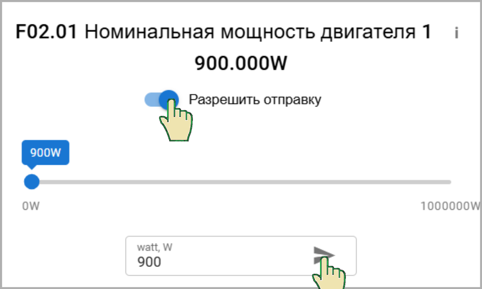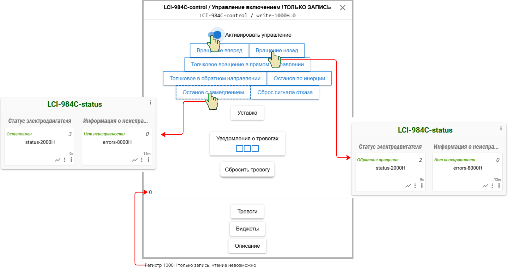 Мы связали новый Параметр блока equipment c index:100 с регистром 1000Р. Атрибут target определяет возможность отправки управляющих сигналов через этот Параметр (name:write-1000H) на ПЧ в регистр 1000H. Атрибут list содержит перечень команд, которые могут быть направлены через данный параметр на ПЧ.