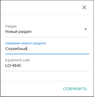 Тип equipment рекомендуется установить INsTART-LCI, так как производится контроль именно этого типа оборудования. Код можно установить любой в соответствии с архитектурой Проекта. Отправляем настройку блока equipment с index:1