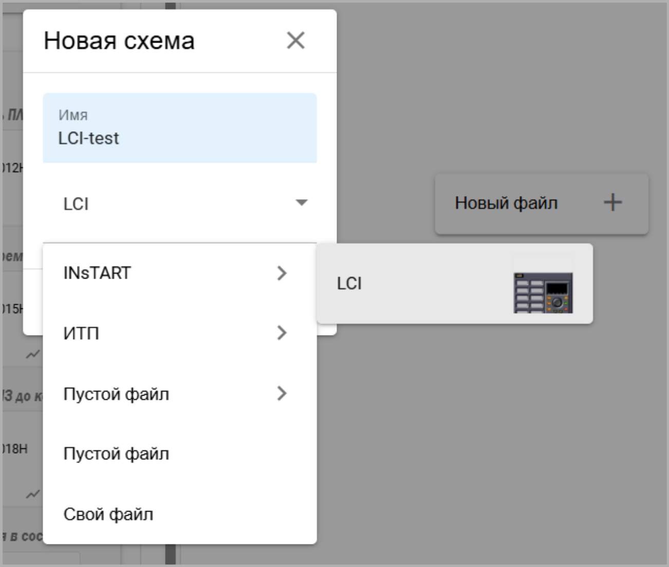 Выбор схемы - Новый файл.Создадим новую схему LCI-test на базе шаблона с изображением ПЧ LCi