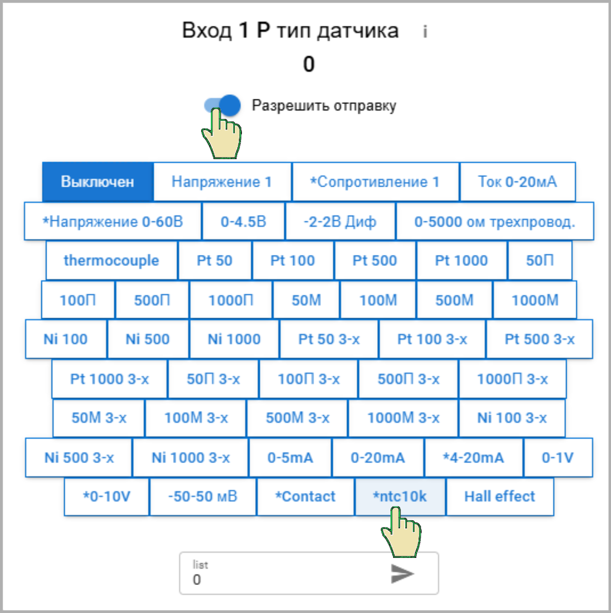 Для датчиков температуры в настройках входа указываем тип датчика ntc10k