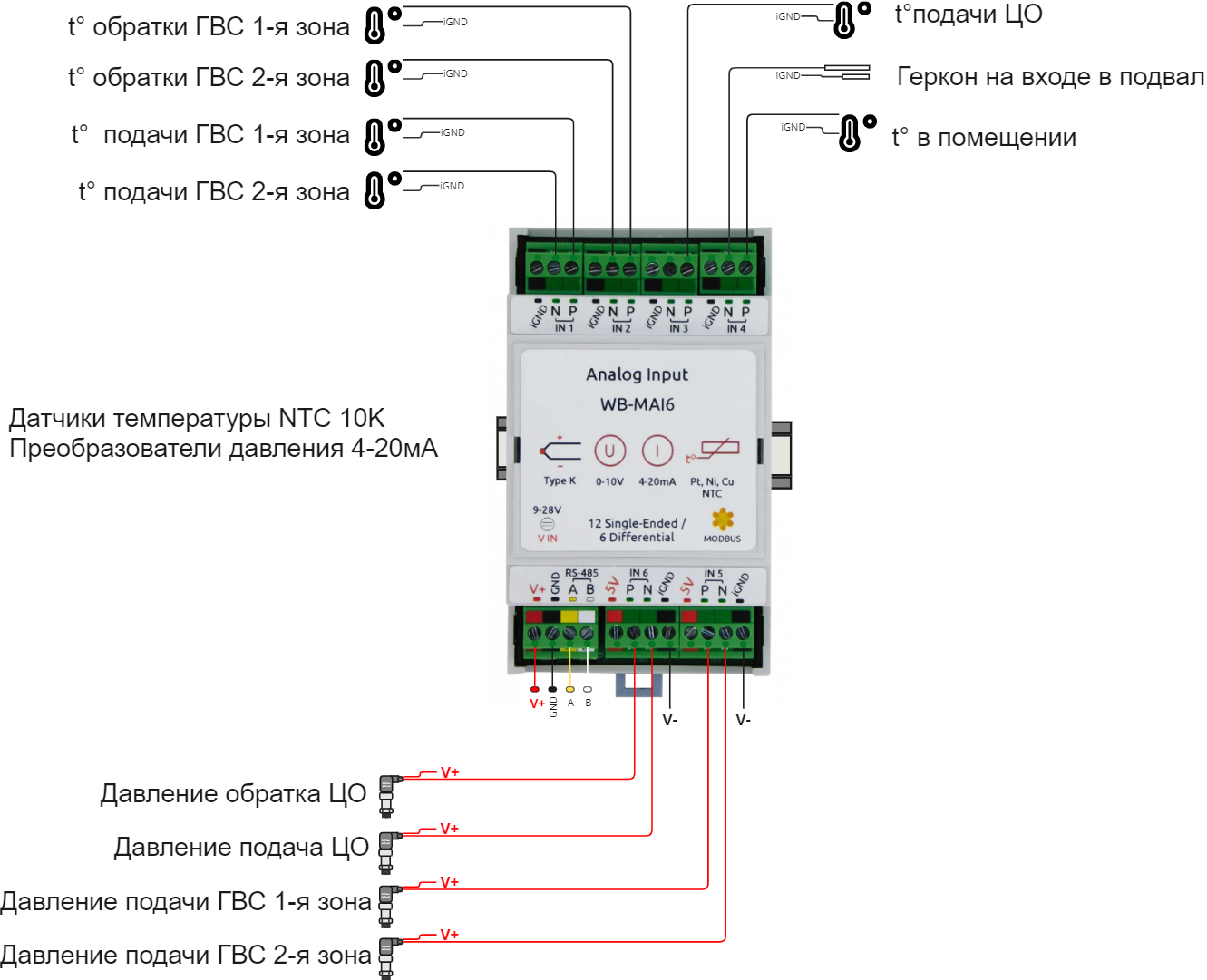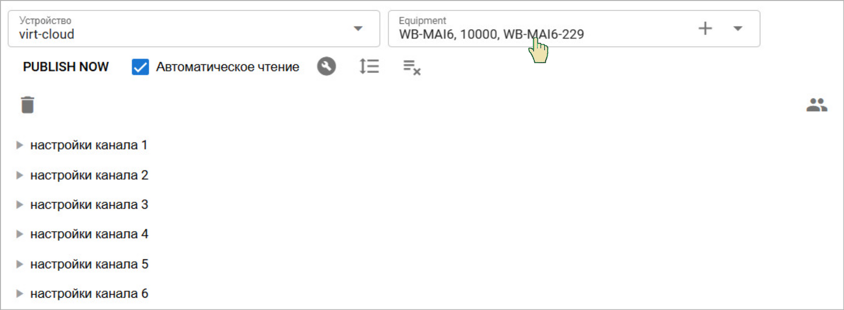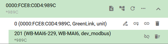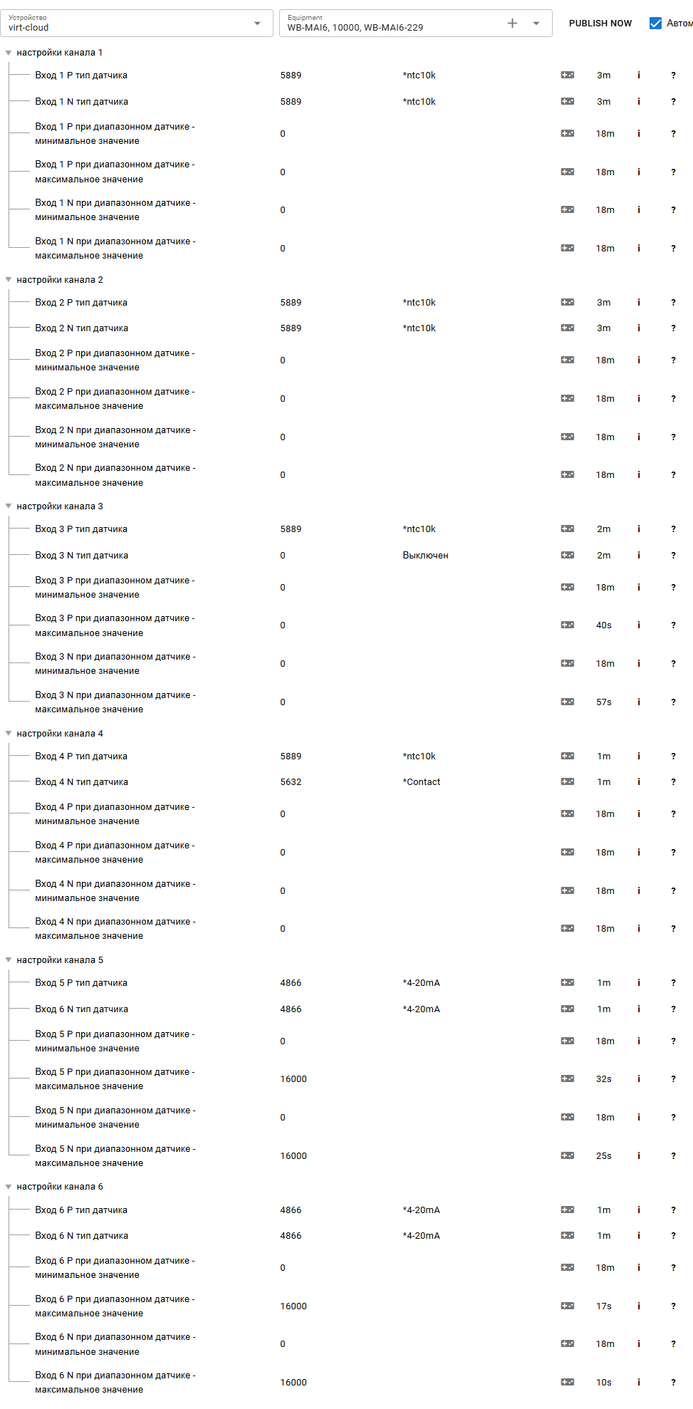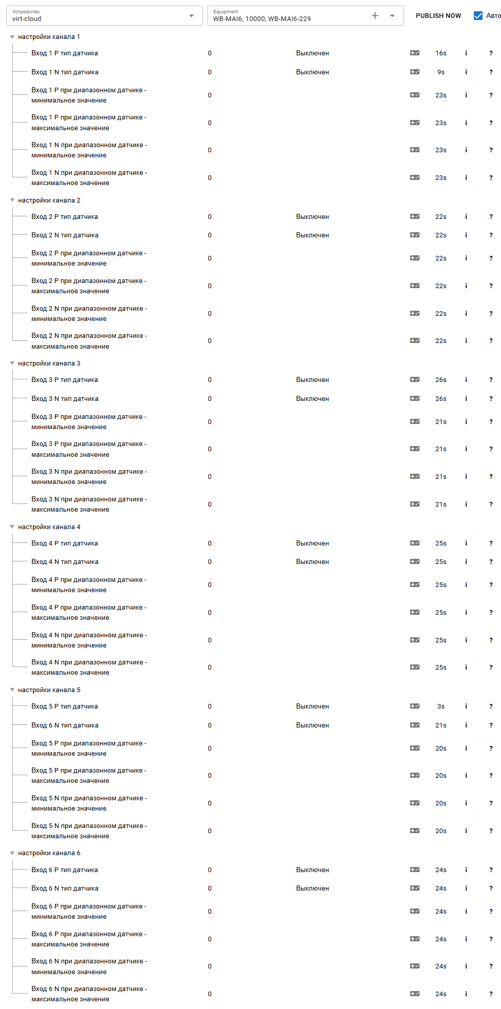 Раскроем все группы для настройки каналов WB-MAI6 Если настройки RS-485 на Устройстве GreenLink и модуле WB-MAI6 совпадают, то через несколько секунд появятся текущие настройки