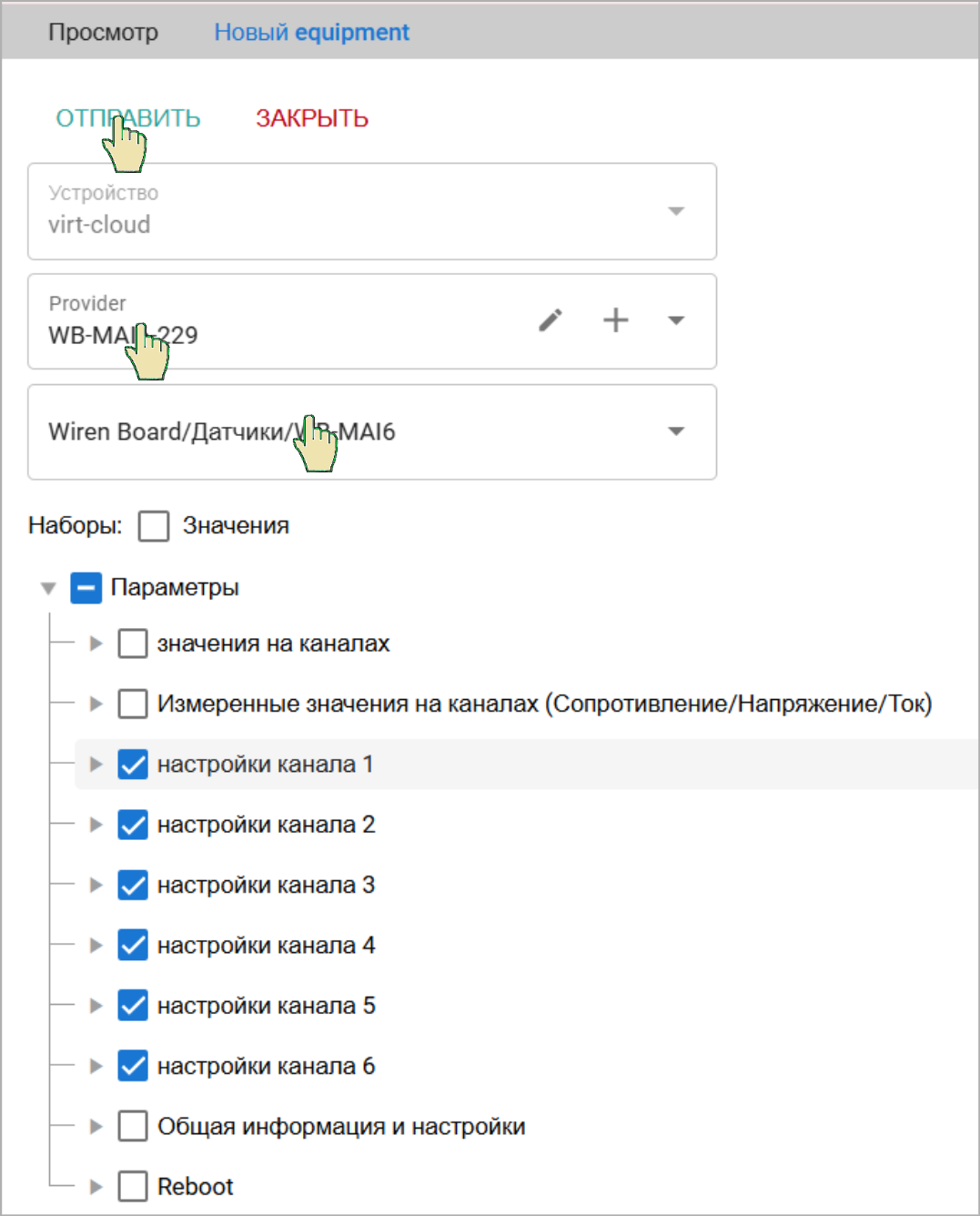 Новый провайдер появится в списке. Выберите его. Так как мы в качестве типа Провайдера dev_modbus на устройстве GreenLink указали WB-MAI6, то система нашла шаблон списка соответствующих модулю параметров Отмечаем галочкой те параметры, которые нам нужны (или выбираем набор) и нажимаем ОТПРАВИТЬ