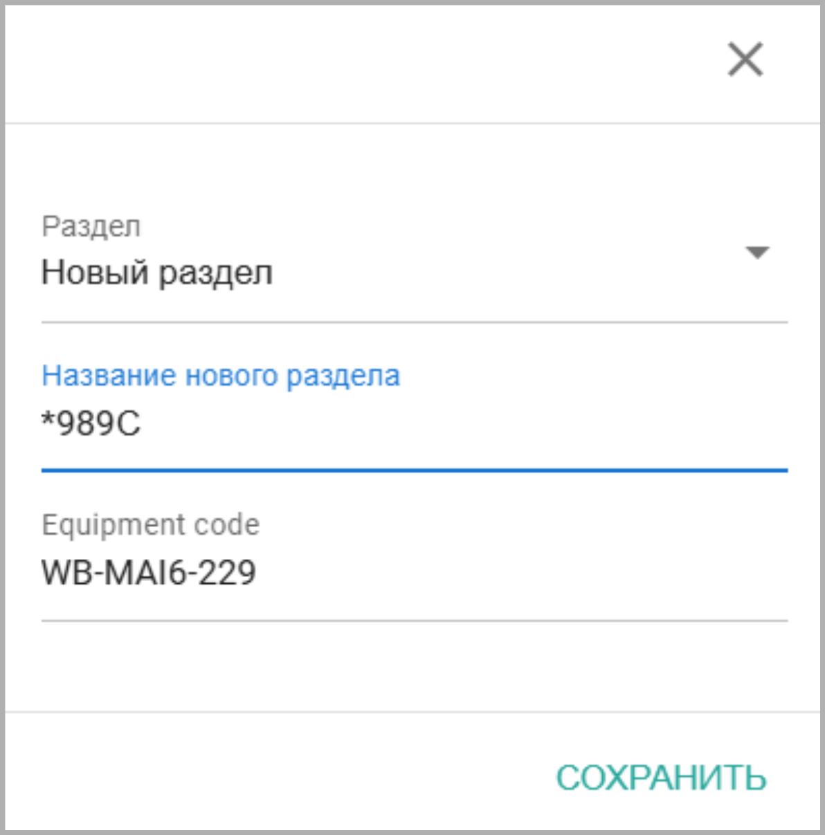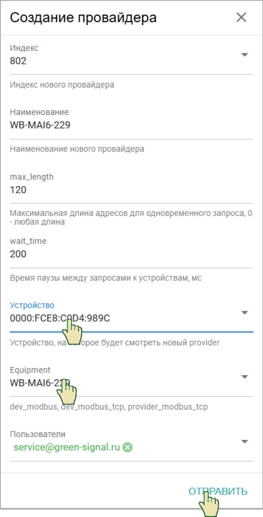 Выберите Устройство GreenLink и Провайдера WB-MAI6. При необходимости, отредактируйте Наименование