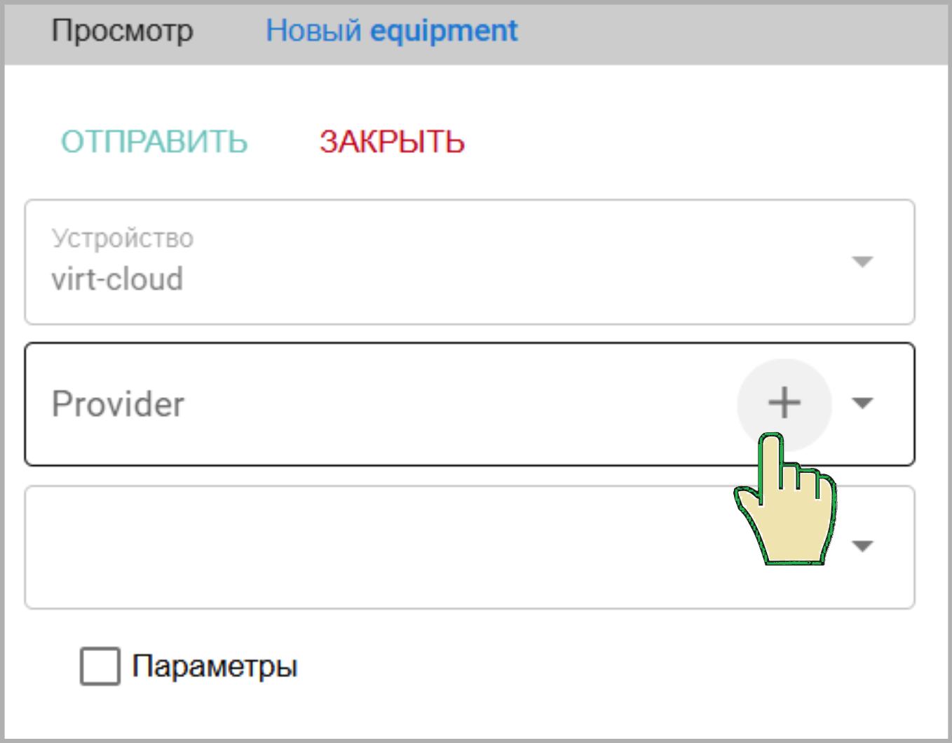 Equipment просмотра параметров оборудования создается на время (index 10000+). Он создается на базе Провайдера сервисного режима. Для перехода к созданию временного equipment нажмите на +(Создать) Откроется окно выбора/создания Провайдера Сервисного режима