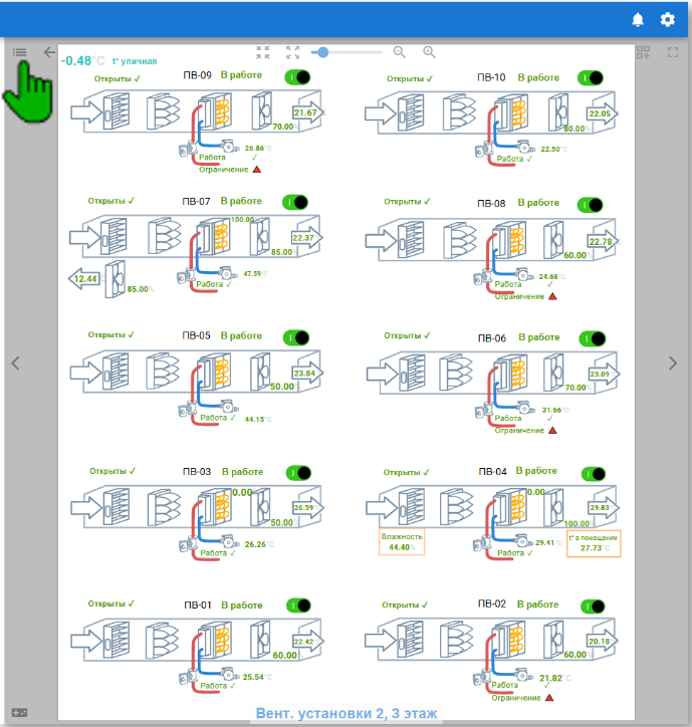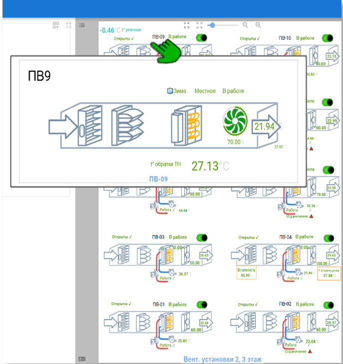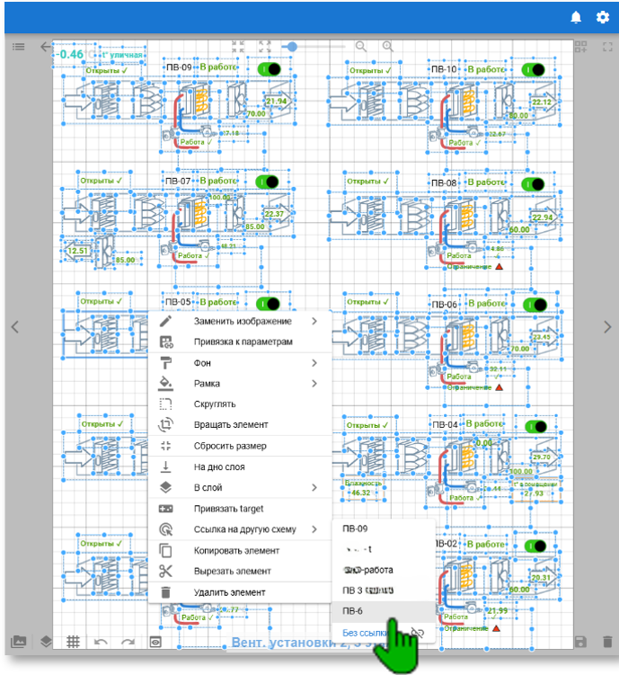 В поле для схем можно разместить несколько объектов, чтобы наблюдать за ними одновременно — это удобно и сразу понятно, где оборудование работает некорректно, и все-таки при таком расположении объекты маленькие и не всегда можно рассмотреть детали. Для этого в приложении есть опция «ссылка на другую схему»: данная опция позволяет рассмотреть объект более детально. Чтобы это реализовать, необходимо заранее создать схему объекта в отдельном поле, после чего выбрать нужный нам объект, щелкнуть по нему правой кнопкой мышки и выбрать пункт «ссылка на другую схему»; далее из выпадающего списка выбираем нужную схему, подтверждаем. Теперь в режиме просмотра общей схемы, наведя курсор на интересующий нас объект, он будет разворачиваться, что позволит рассмотреть всё детально.