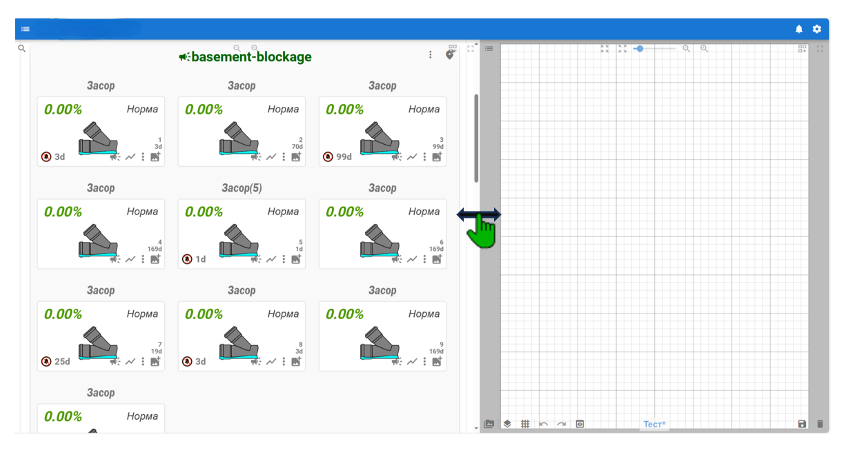 Для удобства работы со схемой ширину окон можно регулировать относительно друг друга, для этого наведите курсор на границe окон зажмите левую кнопку мыши и потяните в нужную сторону. Таким же образом подгоняем границы схемы под нужный нам размер.