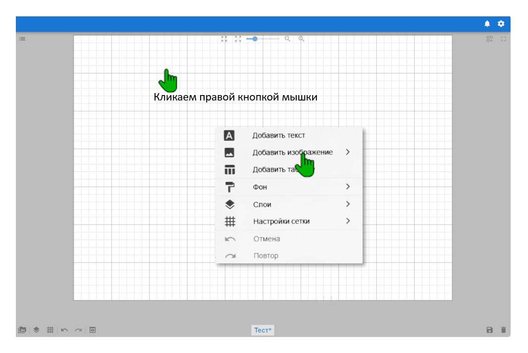 Второй способ Правой кнопкой мыши кликаем в поле для схемы, из выпадающего списка выбираем строку «Добавить изображение», выбираем изображение из уже загруженных или добавляем новое (новое изображение добавляется также, как в первом способе). Чтобы изображение отобразилось на схеме его нужно выбрать из выпадающего списка, кликнув правой кнопкой мышки по полю для схемы. Последующие элементы добавляются аналогично.
