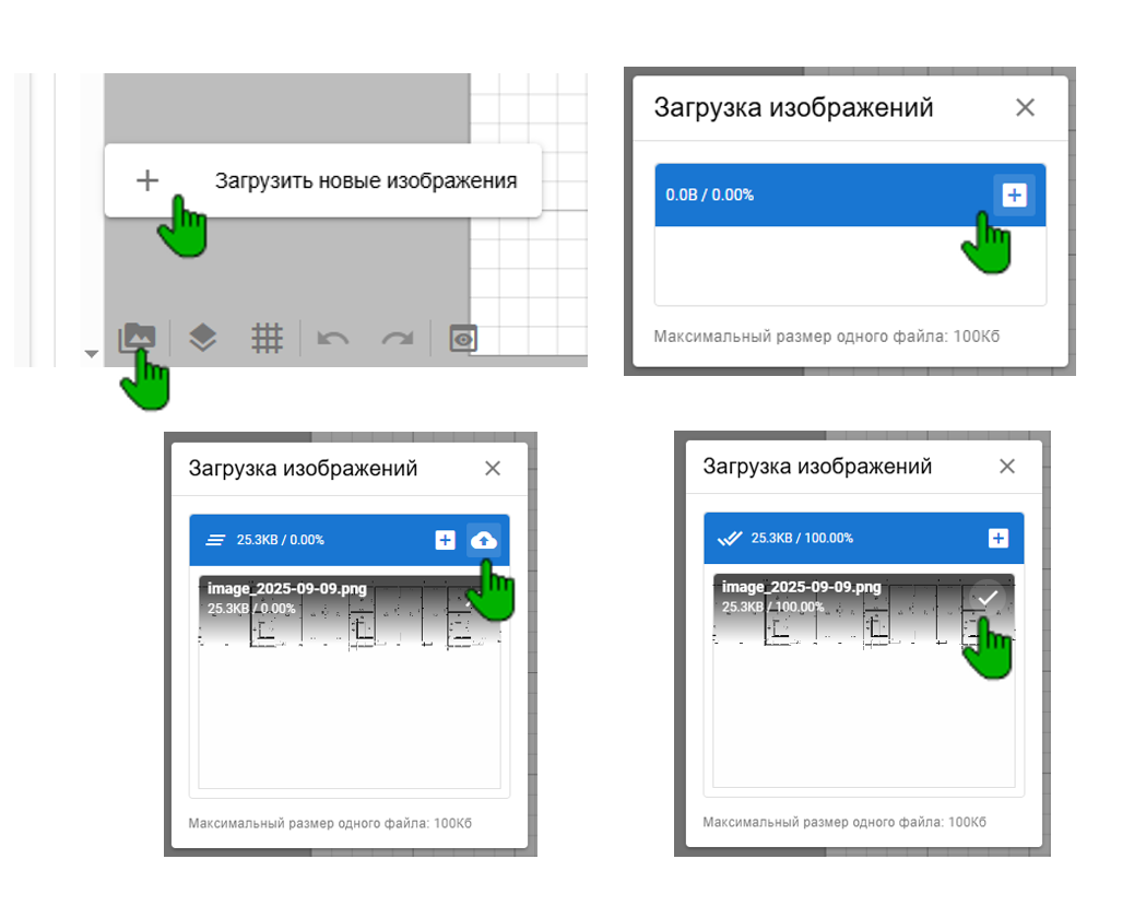 Первый способ В рабочем меню жмем иконку «Изображения проекта» выбираем «Загрузить новые изображения», появится окно «Загрузка изображений» в котором жмем плюсик, далее на вашем устройстве выбираем необходимое изображение, изображение появится в окне «Загрузка изображений» жмем облако и затем галочку – изображение добавлено.