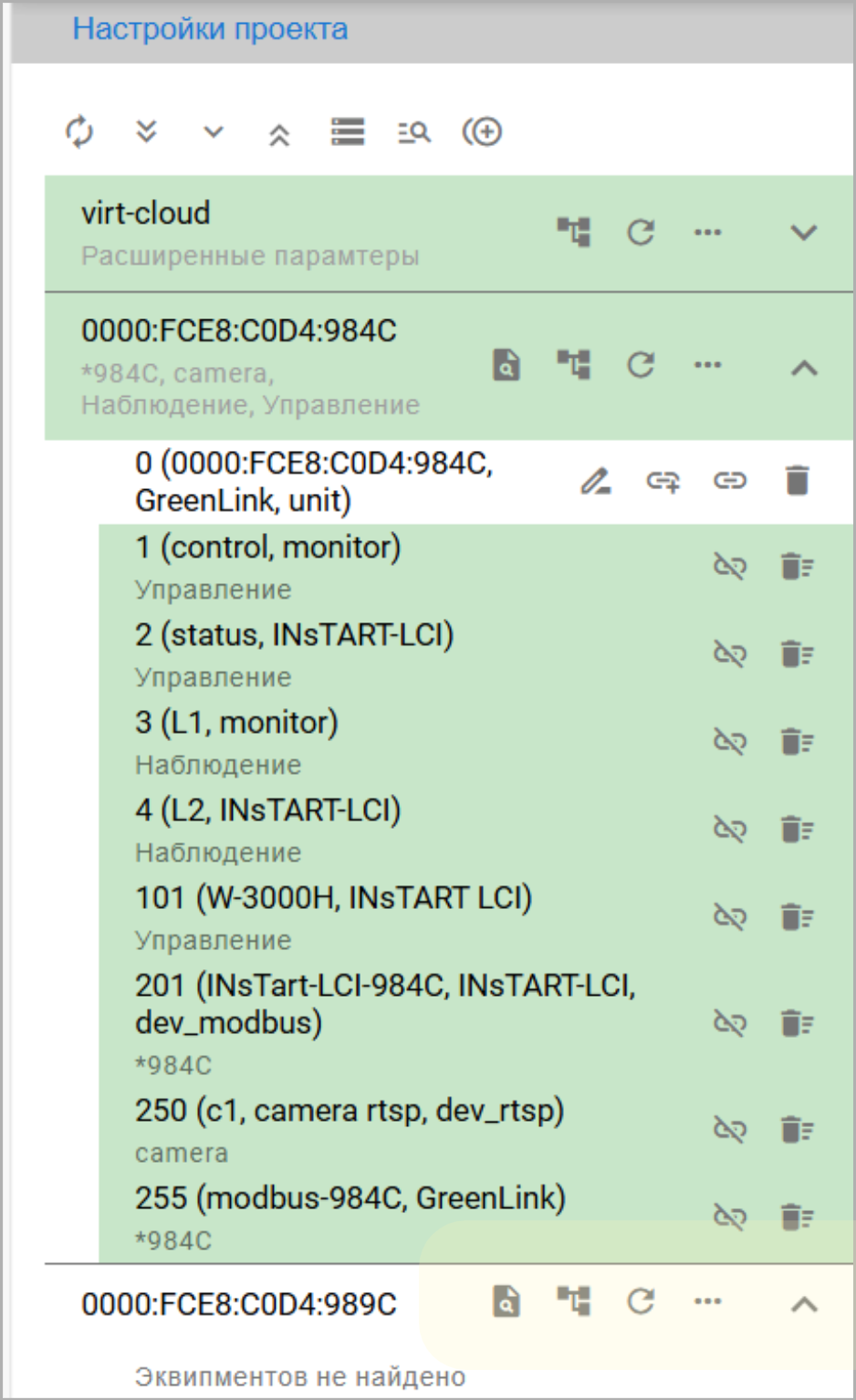 Если GreenLink не настроен и на нем отсутствуют функциональные блоки equipment, перейдите к его настройке в соответствии с подключенным оборудованием