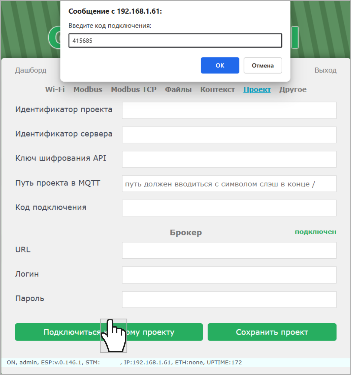 В Админке GreenLink перейдите в Настройки->Проект Нажмите Подключиться к новому проекту Введите код.