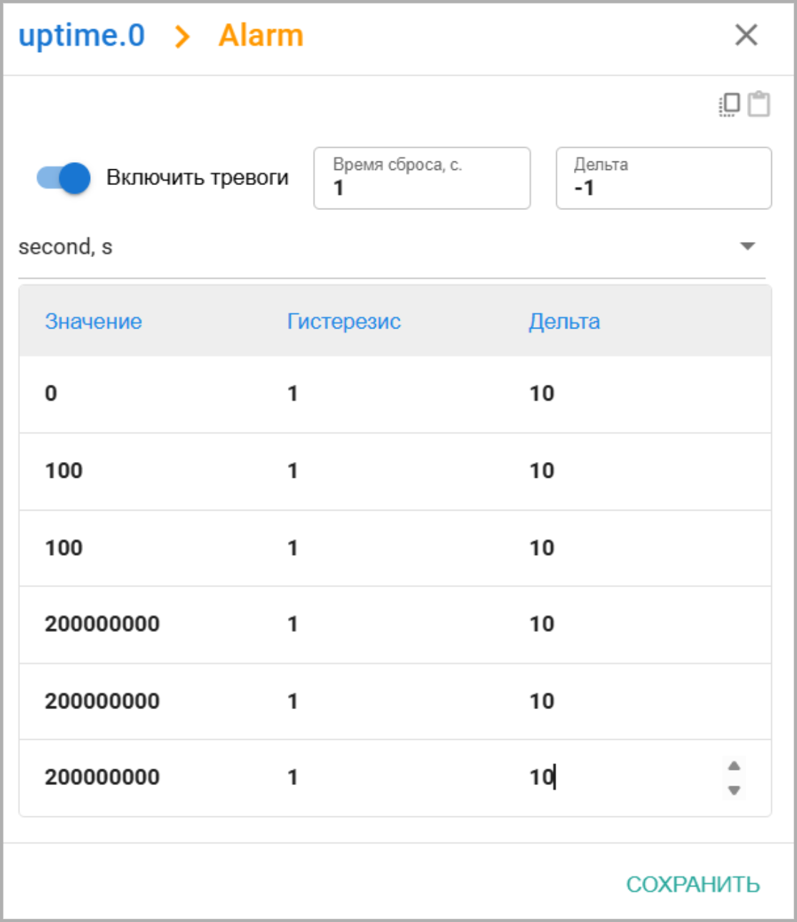 После 100 секунд - через Время сброса в 1 секунду тревога прекратится