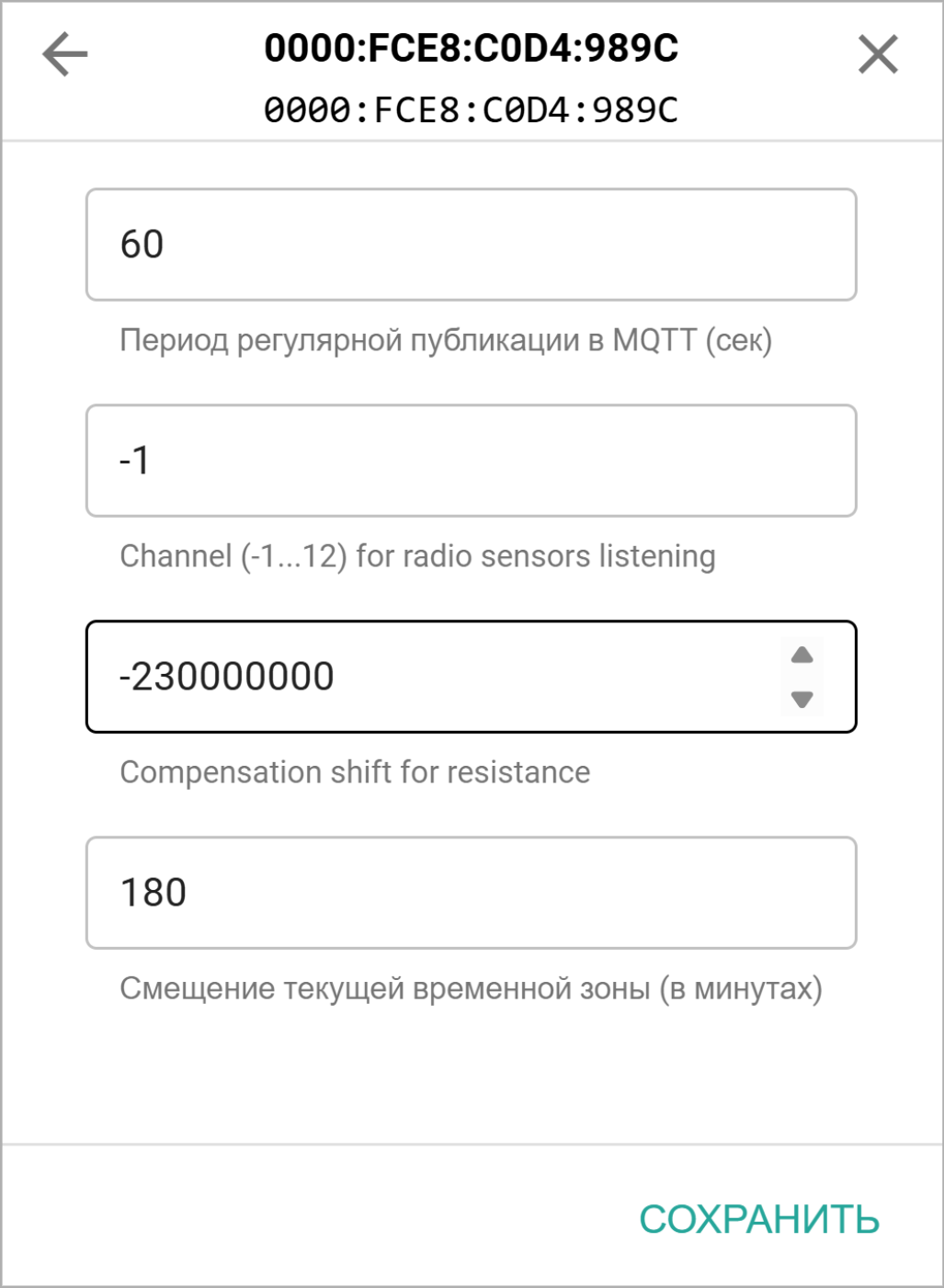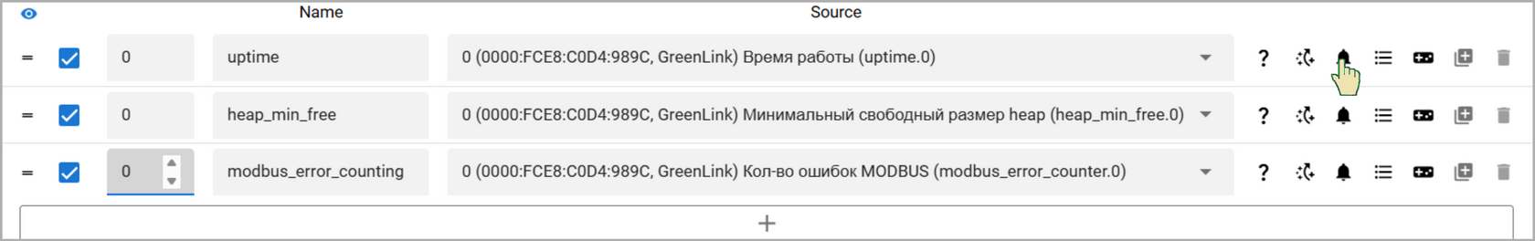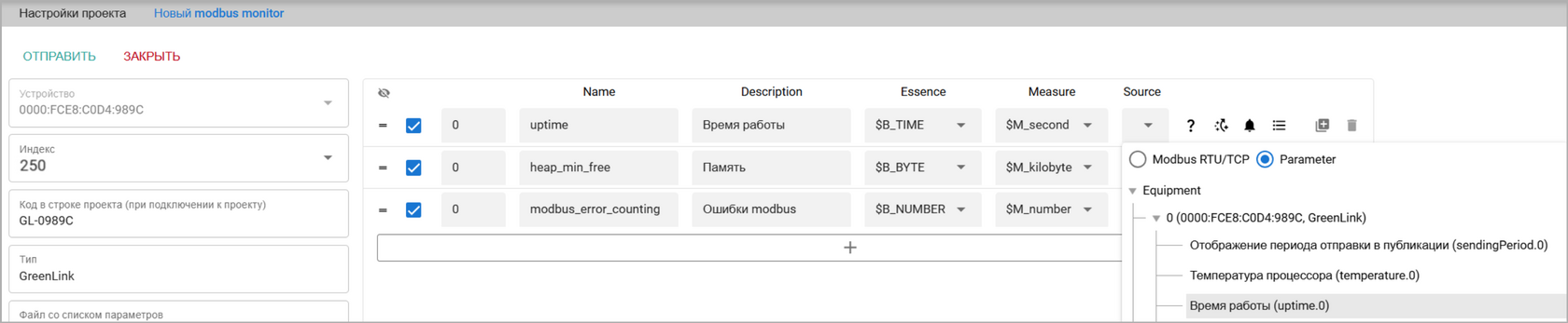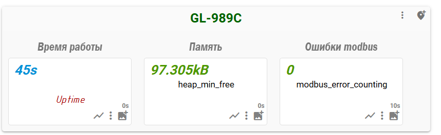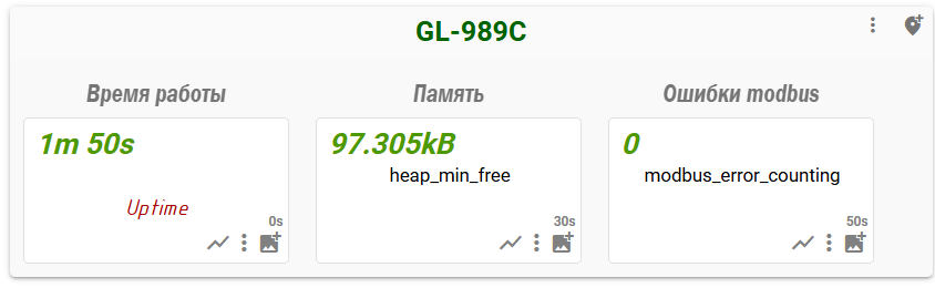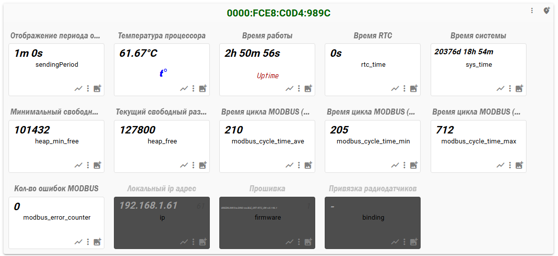 Период отправки - sendingPeriod, период регулярной публикации значений параметров equipment unit, может быть изменен редактированием соответствующей переменной. Влияет на Настройки->Уведомление о потере соединения Время работы - uptime, время, прошедшее с момента последней перезагрузки Минимальный свободный объем heap - контроль критического состояния памяти с момента последней перезагрузки. Значение менее 30кБ (30000) указывает или на большой объем созданных функциональных блоков equipment или на плохое качество связи. Текущий свободный размер heap - контроль расхода памяти на текущую настройку с учетом всех созданных блоков equipment. Значение в 70кБ (70000) указывает на предельную возможность нормального функционирования GreenLink Локальный ip адрес - адрес в локальной сети при подключении по WiFi, по которому доступна Админка GreenLink Время цикла MODBUS, минимальное (мс) - время минимального цикла за последние 10 секунд Время цикла MODBUS, среднее (мс) - усредненное время за последние 10 секунд Время цикла MODBUS, максимальное (мс) - время максимального цикла за последние 10 секунд Кол-во ошибок MODBUS - количество ошибок чтения/записи, зафиксированное с момента последней перезагрузки