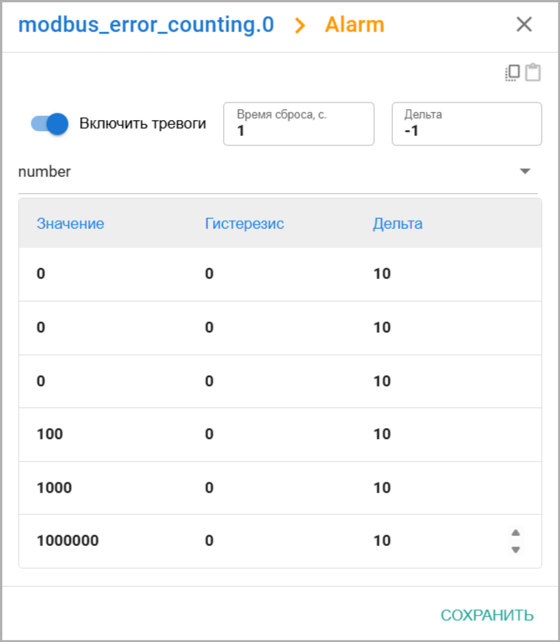 Настройте атрибут alarm для контроля ошибок Mодbus