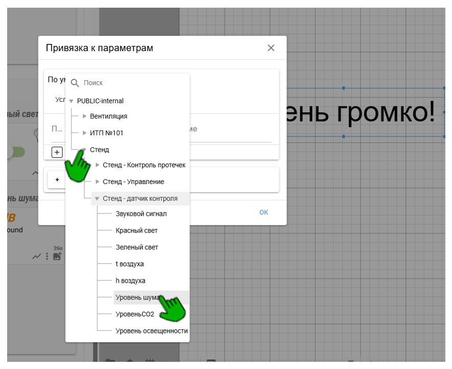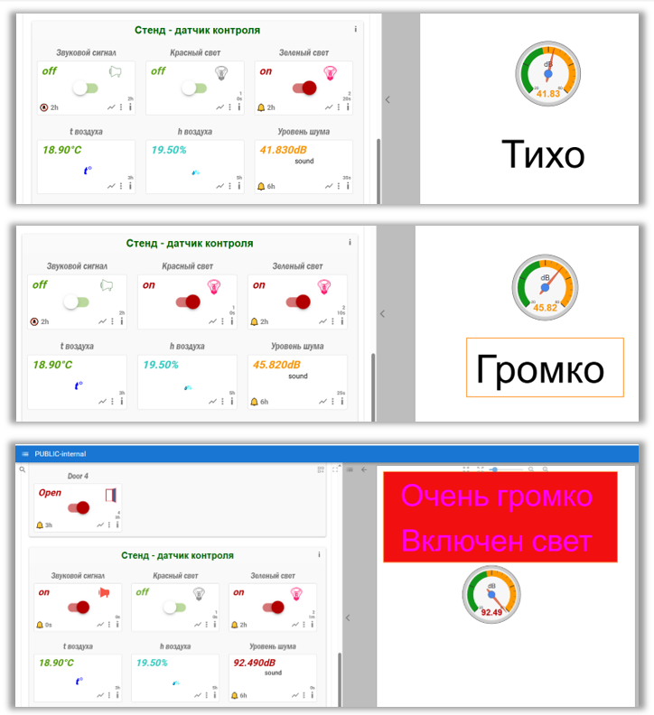 Отобразить на схеме три сообщения: «Тихо», «Громко!», «Очень громко!!!». Отобразить их нужно в зависимости от изменения параметра датчика уровня шума. Для этого нужно выполнить следующие шаги.