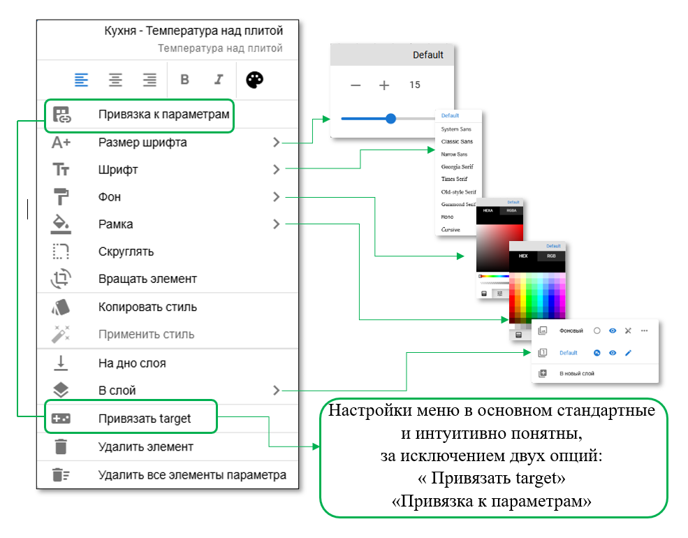 При добавлении параметра на схему - иконка, значение и название образуют три элемента. Каждый элемент можно настроить индивидуально, для этого щелкните по нему правой кнопкой мыши - появится контекстное меню, по настройке выбранного элемента.