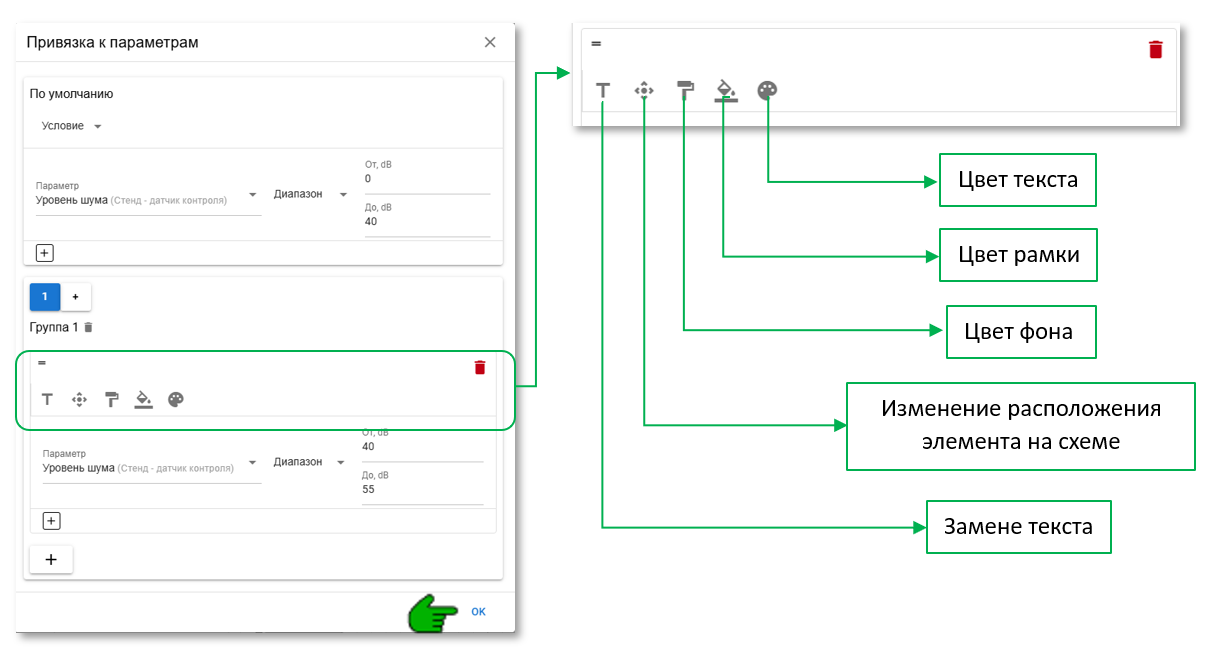 Чтобы при изменении шума изменялось сообщение нужно выполнить следующие действия. В окне «Привязка параметров» в нижней строке жмем плюсик (добавить группу замен) добавится шаблон для замены с собственным набором инструментов для редактирования элемента