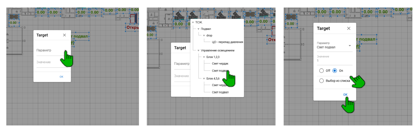 Target позволяет управлять устройством дистанционно непосредственно со схемы, например – управление освещением. Для этого необходимо выполнить следующие шаги: