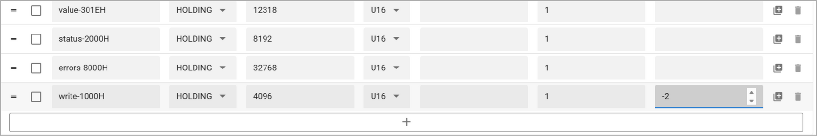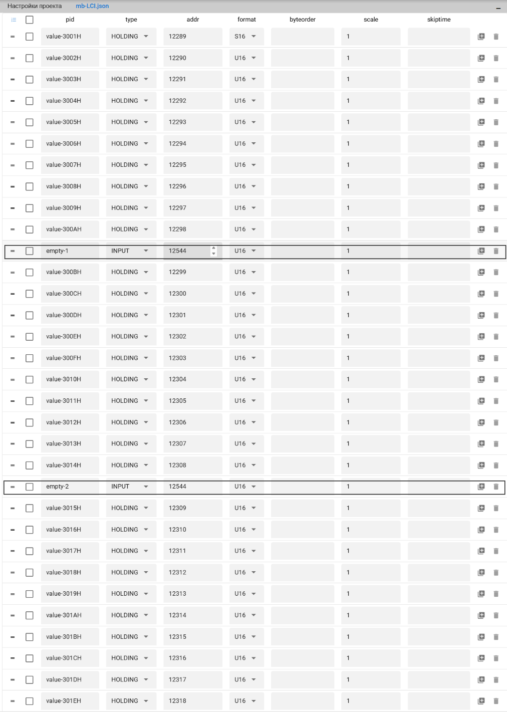 Провайдер при организации чтения регистров склеивает идущие подряд, без промежутков, регистры. В данном случае мы имеем 30 идущих подряд регистров. Поэтому необходимо сообщить Провайдеру о необходимости ограничения 10-ю регистрами. Для этого можно переставить группы регистров местами или. что мы и сделаем, добавить через каждые 10 идущих подряд регистра, вставим несуществующий регистр, на который не ссылаются Параметры
