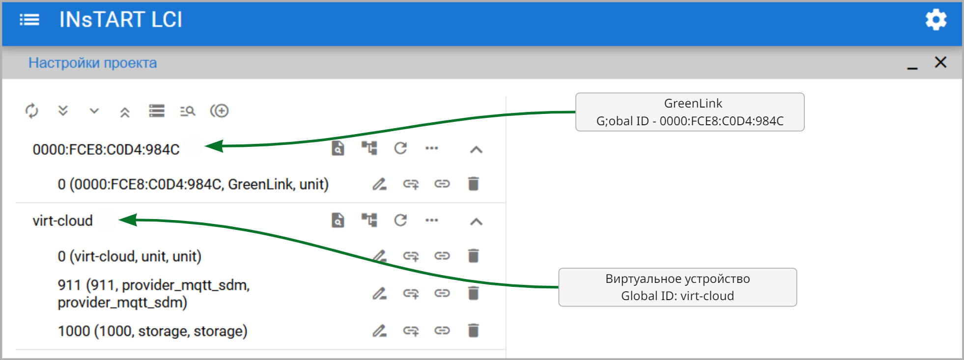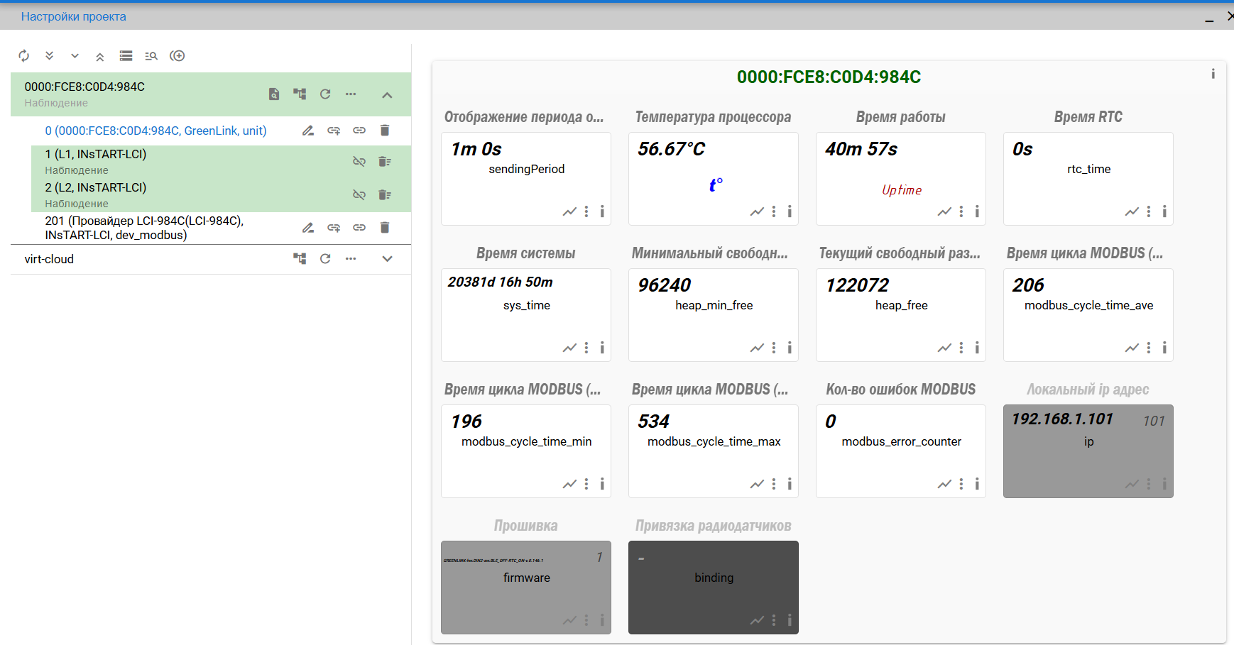На Устройстве GreelLink настроен только служебный equipment unit На виртуальном устройстве настроен служебный equipment storage - отвечает за сохранение значений Параметров Проекта в Базу Данных.