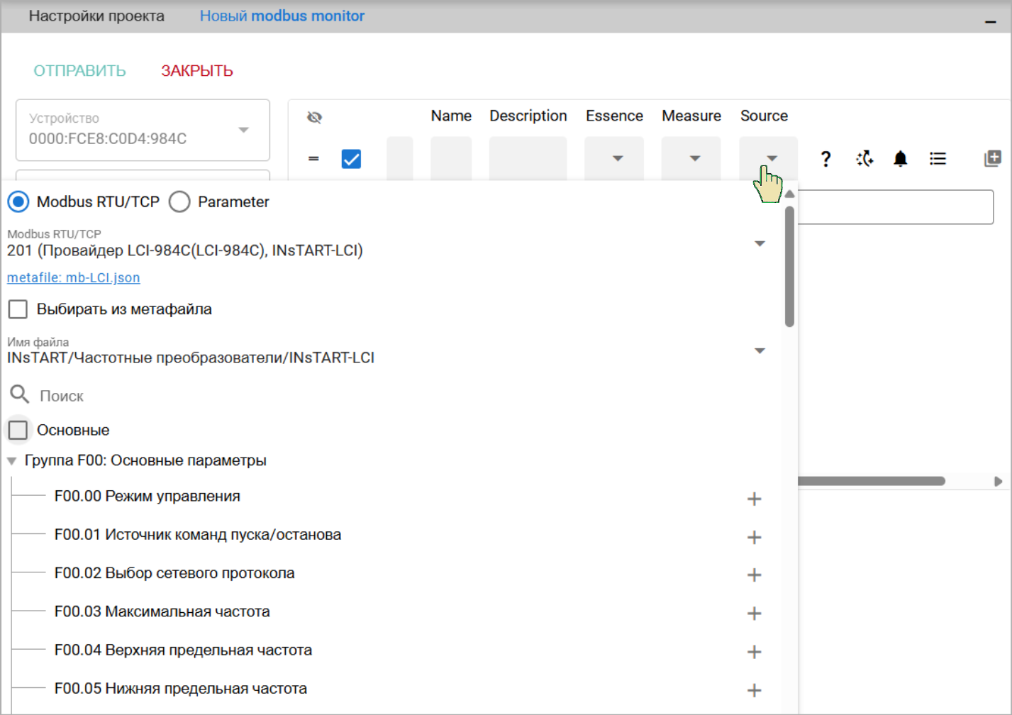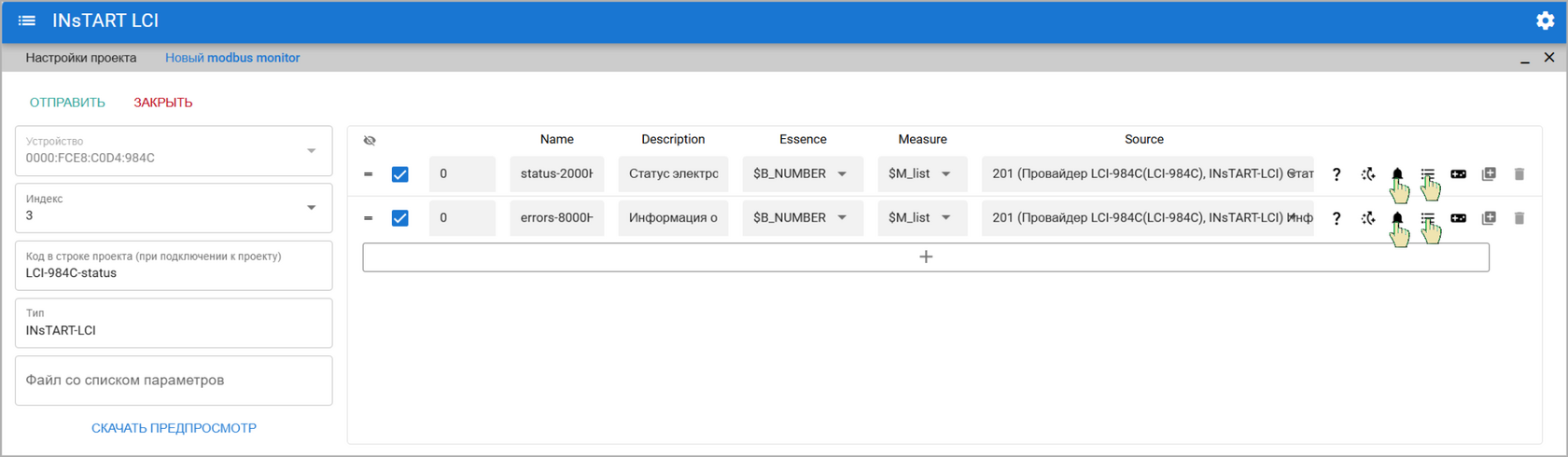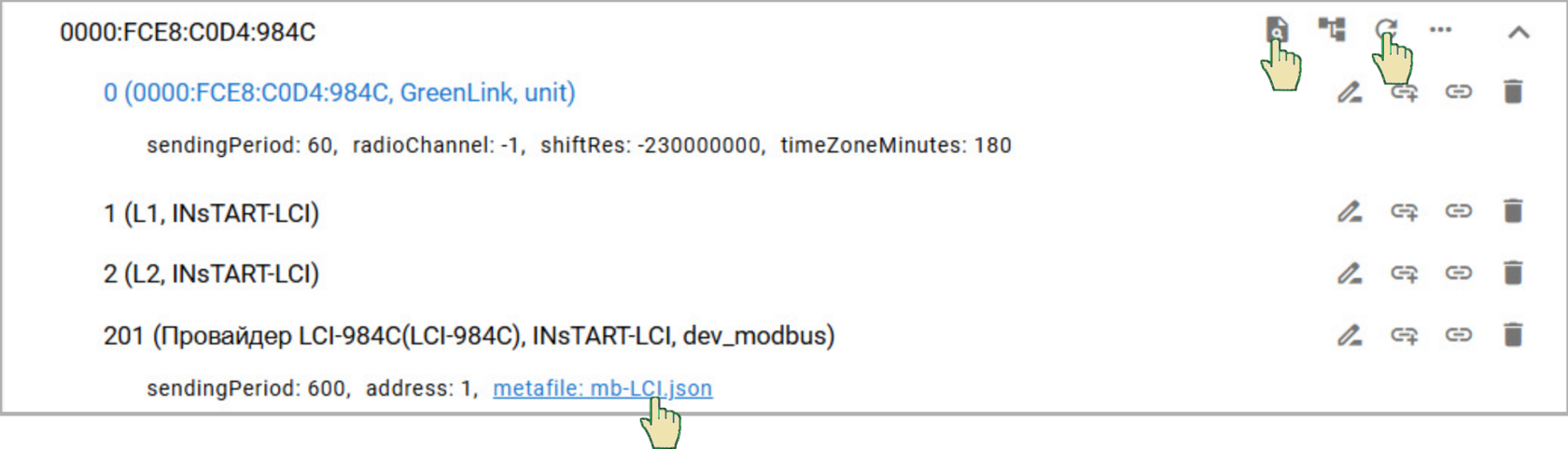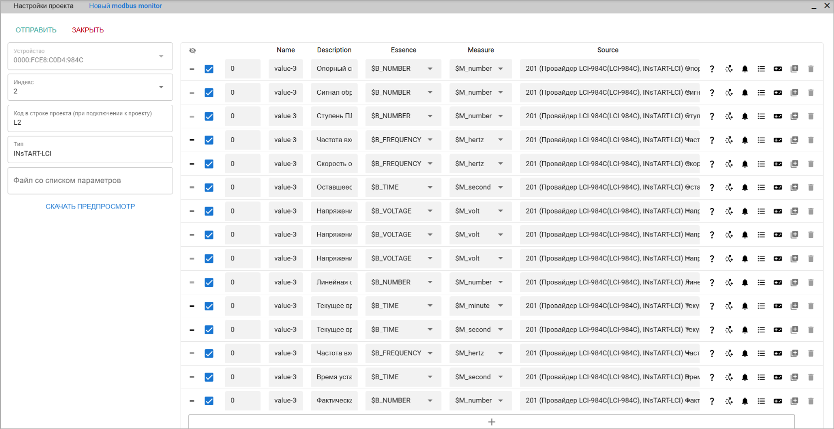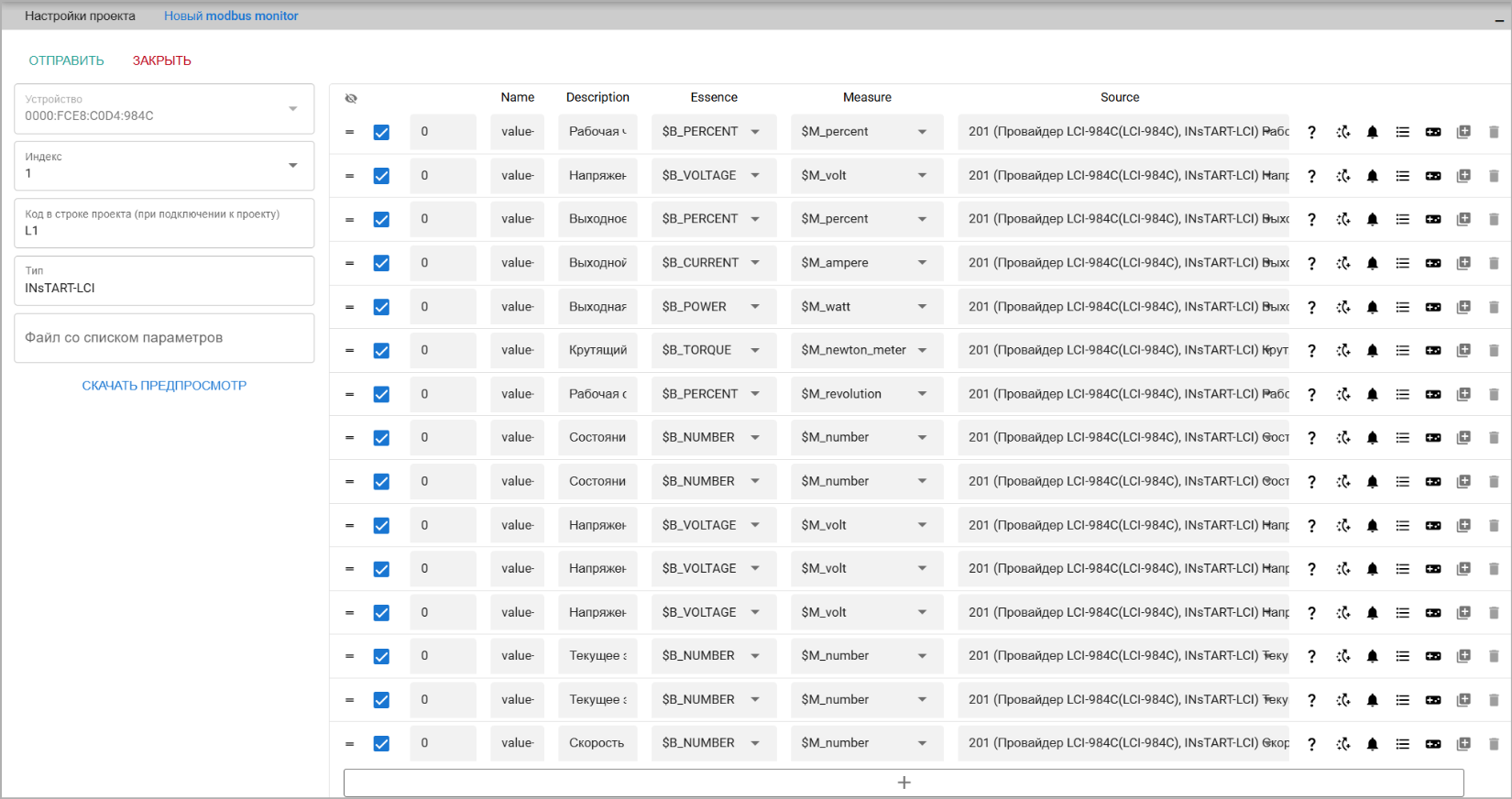 Нажмите на значок - прочитать Параметры equipment. У Провайдера появится информация об установленном адресе modbus и выбранном metafile При создании блоков Наблюдения, добавлении Параметров metafile mb-LCI.json был автоматически заполнен строками с адресами modbus-регистров, соответствующих параметрам наблюдения.