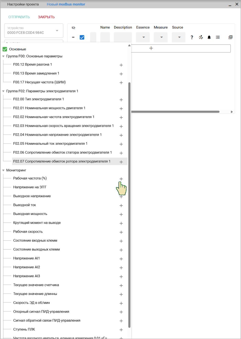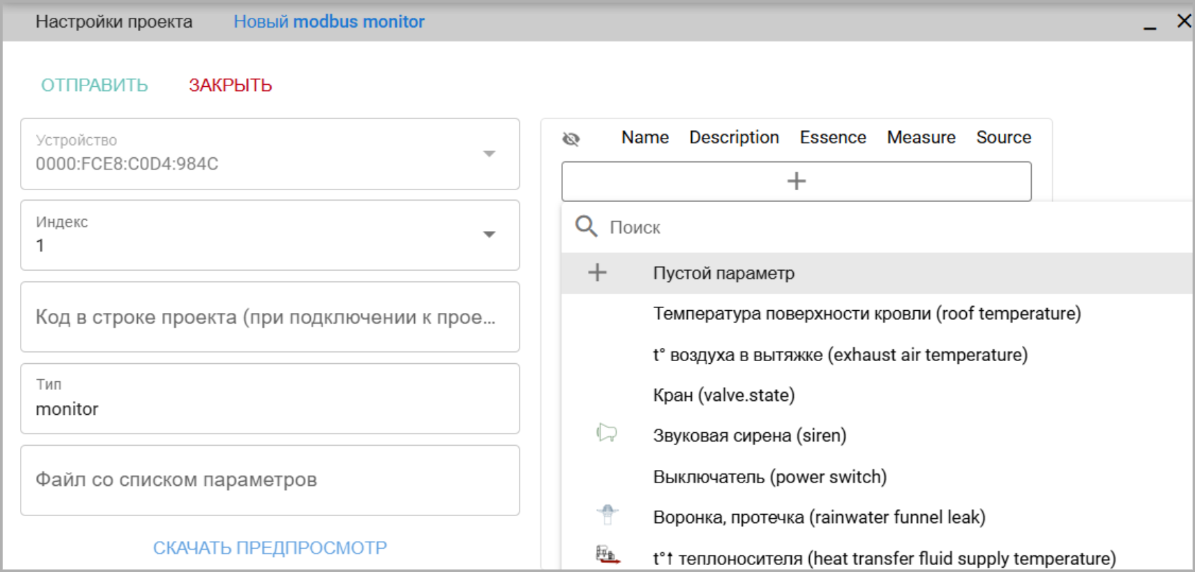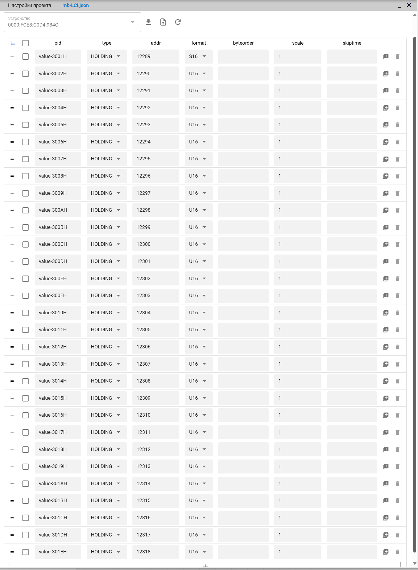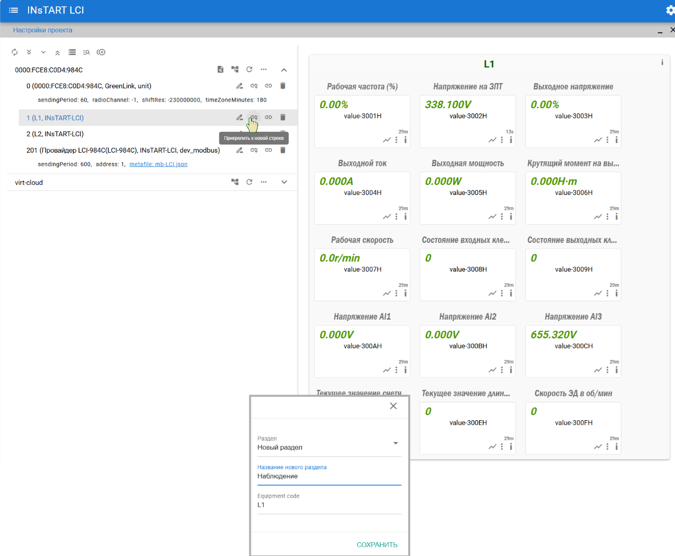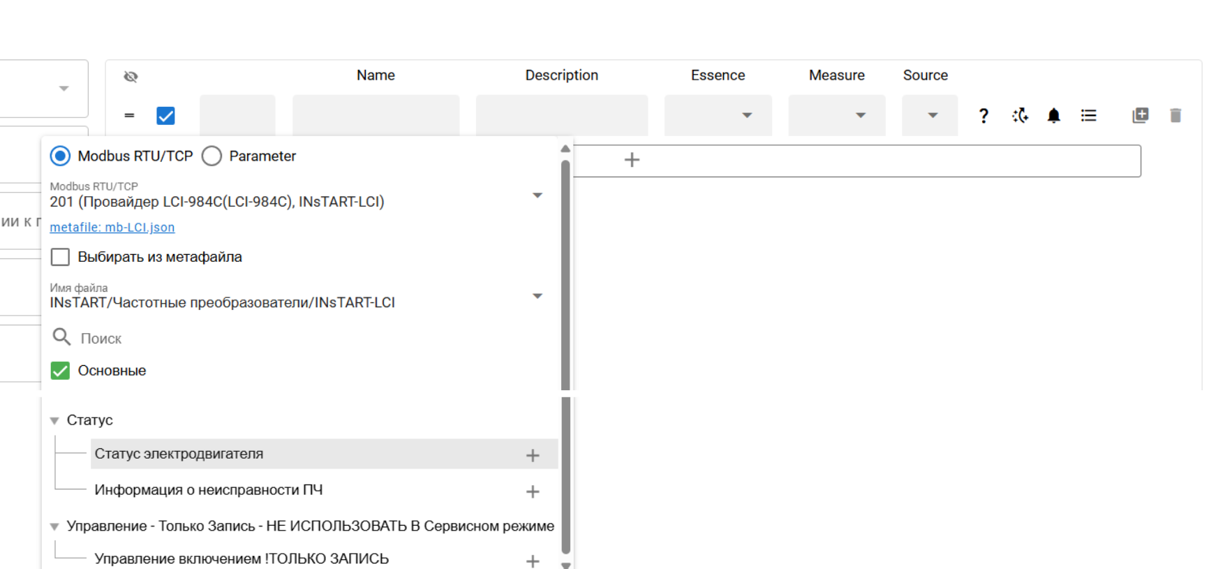 Нажмите на значок - прочитать Параметры equipment. У Провайдера появится информация об установленном адресе modbus и выбранном metafile При создании блоков Наблюдения, добавлении Параметров metafile mb-LCI.json был автоматически заполнен строками с адресами modbus-регистров, соответствующих параметрам наблюдения.