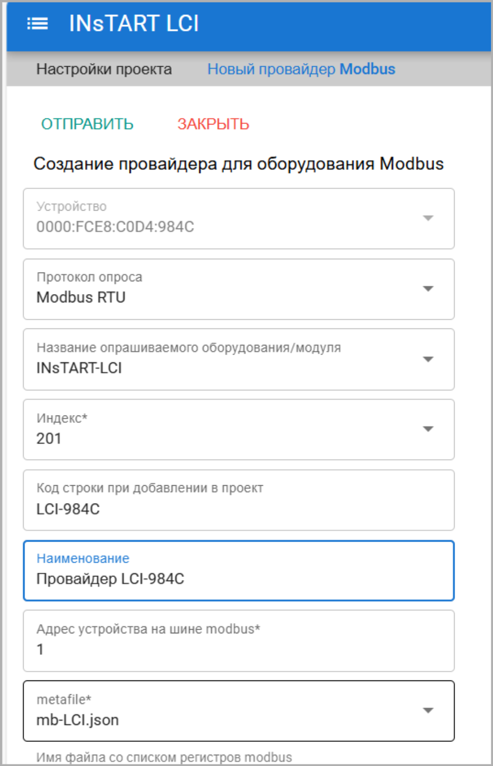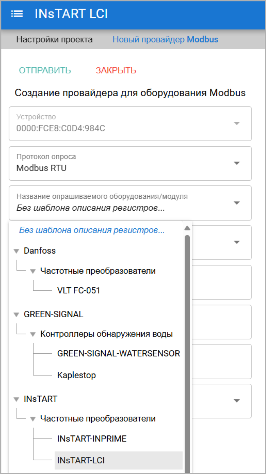 Для корректной работы с ПЧ LCI необходимо создать на GreenLink Провайдера dev_modbus