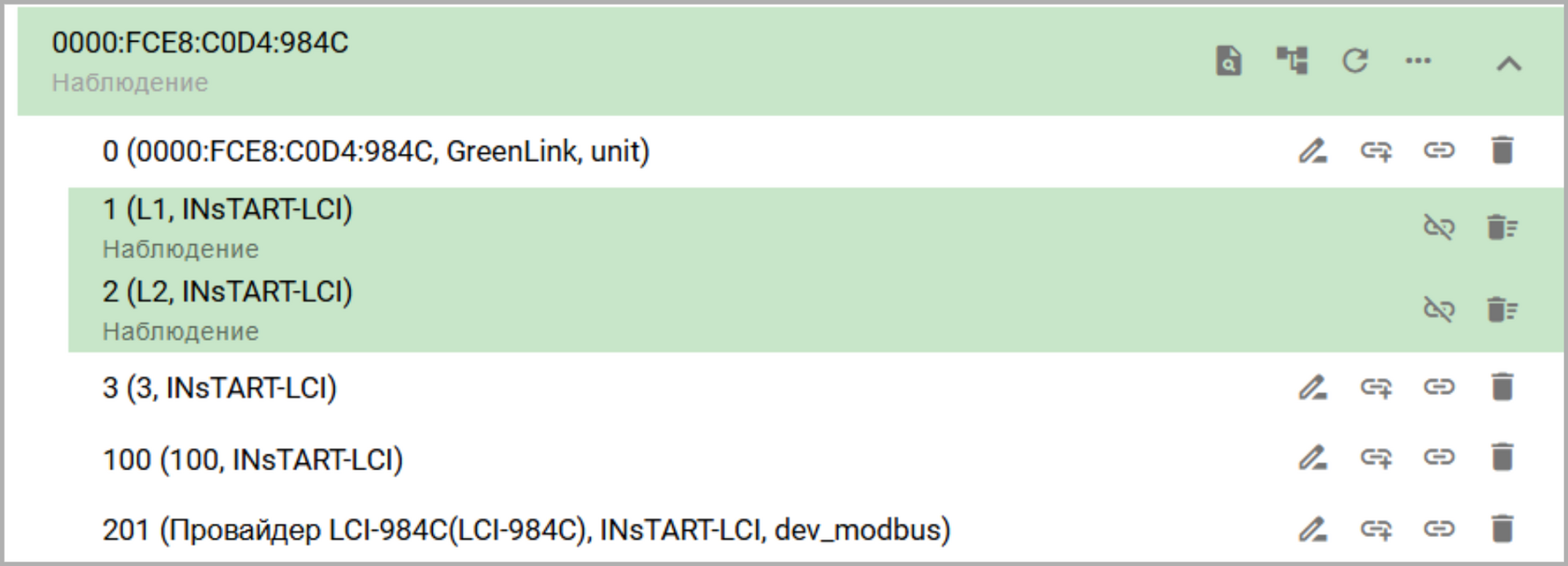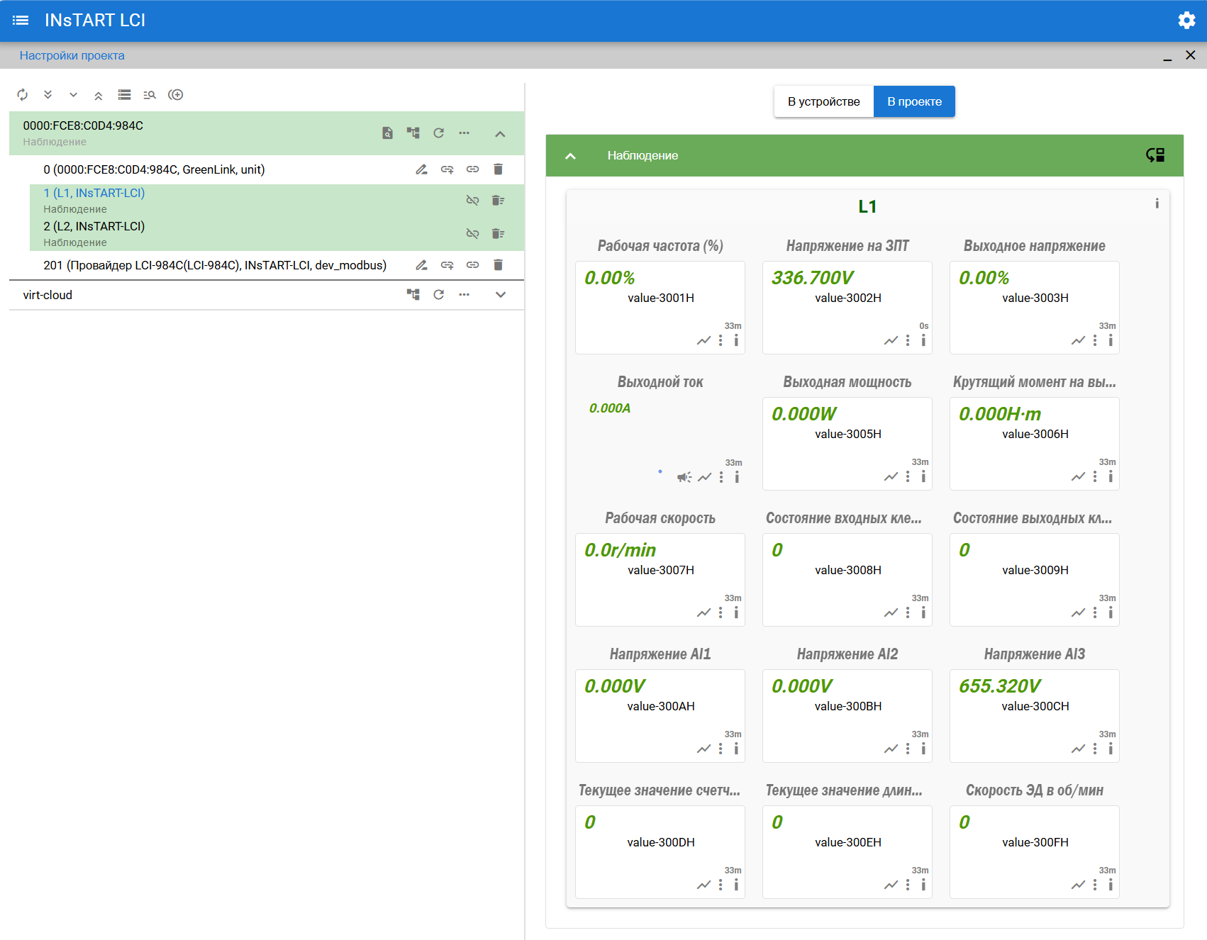 Создать на GreenLink блоки Наблюдения с Параметрами, которые будут контролировать состояние LCI в реальном времени и подключить их к Проекту