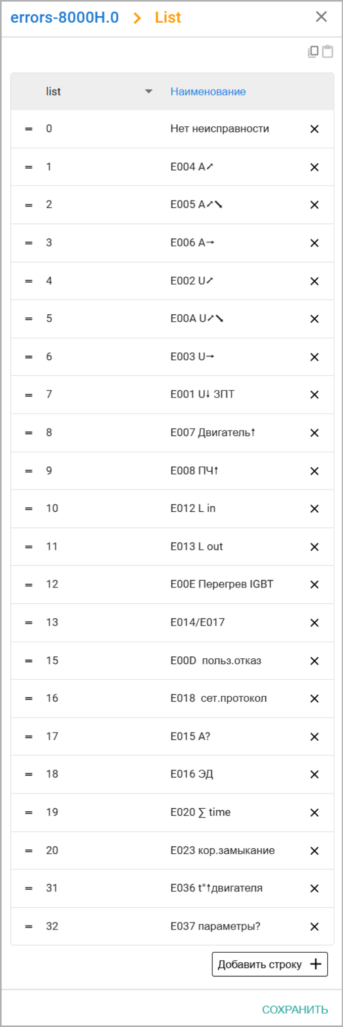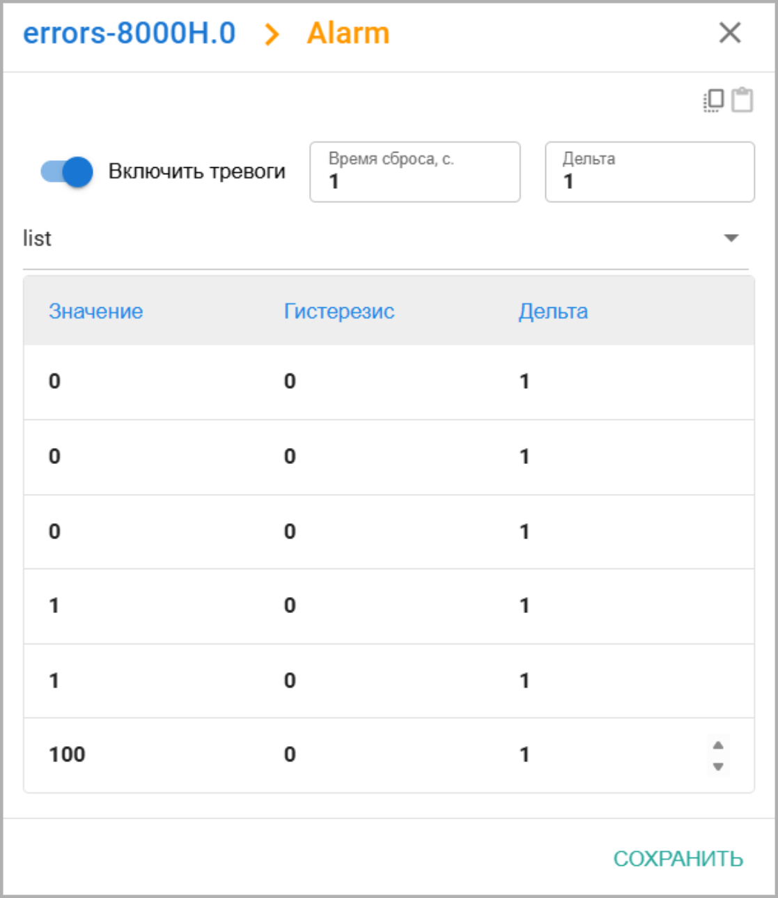 Чтобы получать уведомления о возникновении ошибки, т.е. значение параметра больше 0, мы заполнили таблицу уровней. При любом значении больше 0 - уровень тревоги станет 5 (красный) и взведется флаг тревоги