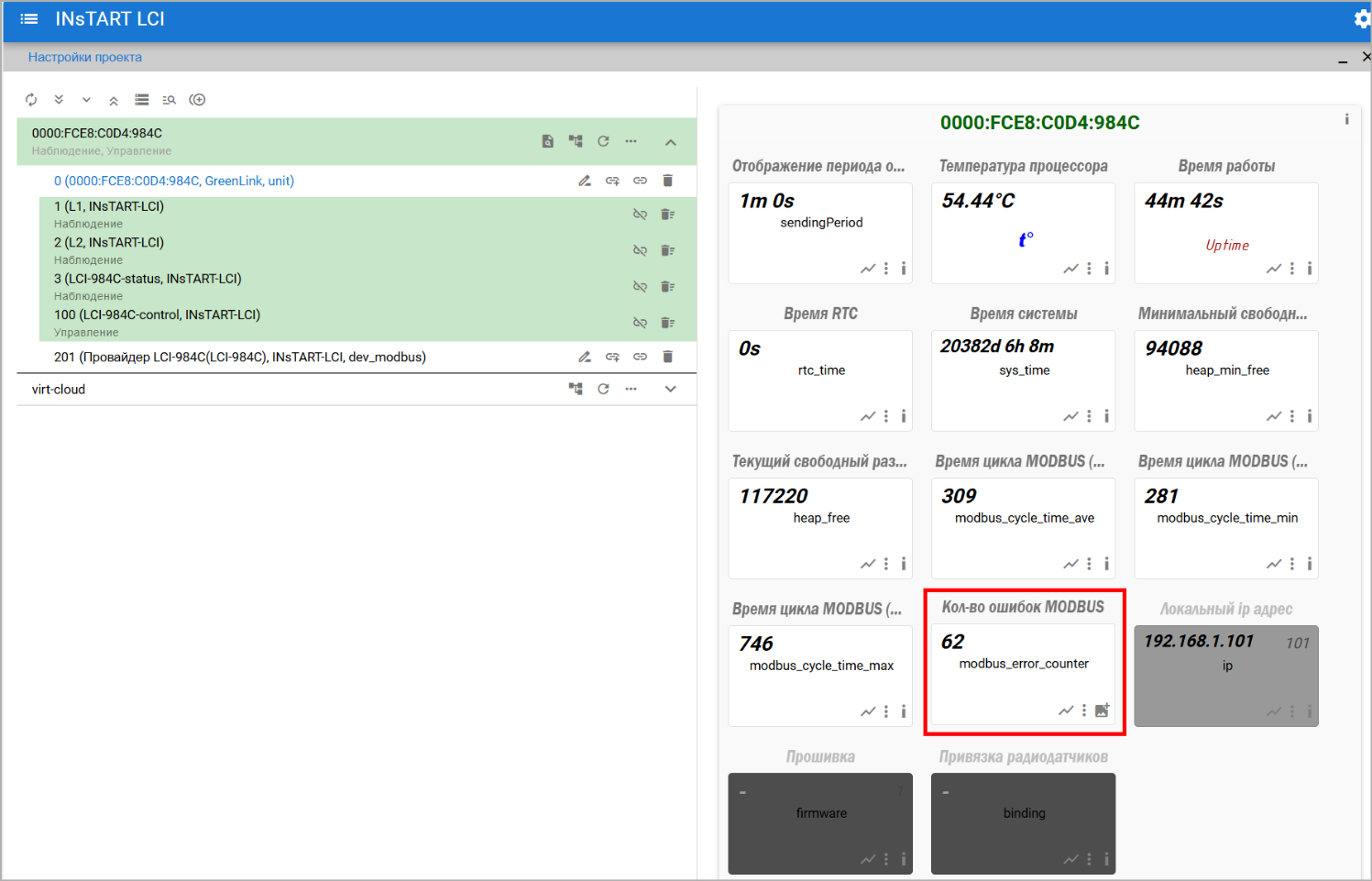 Как правило, modbus-адрес установлен по умолчанию 1. При непосредственном подключении GreenLink к LCI и отсутствию других устройств на шине, можно оставить адрес по умолчанию