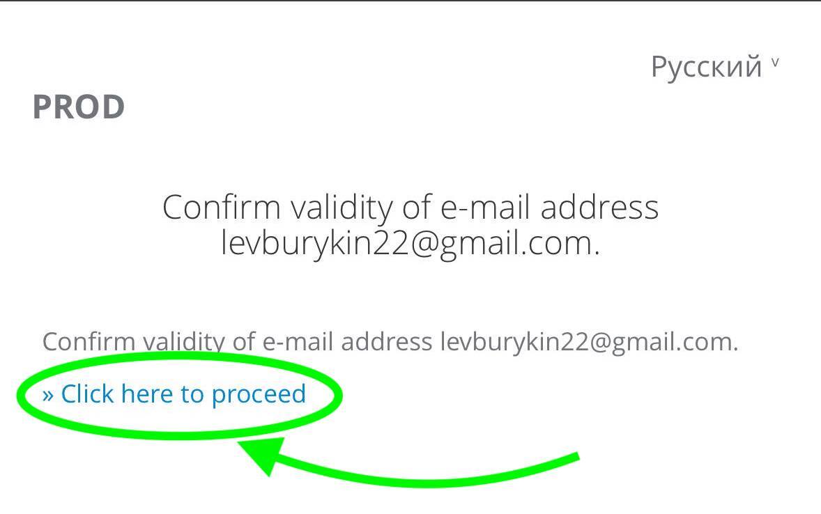 Указываем свой e-mail (с маленькой буквы), пароль, имя, фамилию, телефон и снова жмем регистрация, если все успешно система сообщит, что для вам было отправлено письмо для подтверждения адреса e-mail (письмо может прийти в течении 15 минут). В письме нужно перейти по ссылке и подтвердить свой адрес кликнув по кнопке "Click here to proceed"