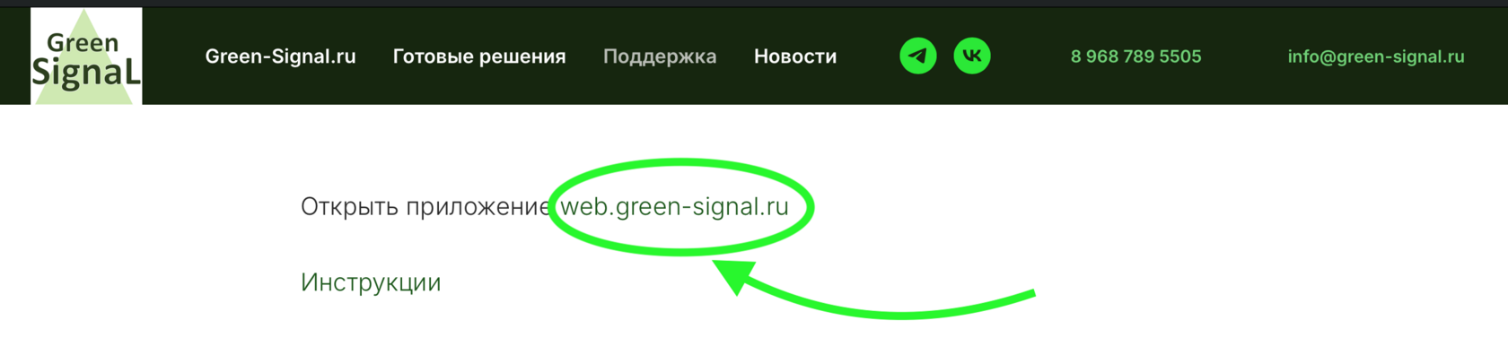 Для регистрации в приложении необходимо зайти на сайт Green-Signal.ruзайти во вкладку "Поддержка" и перейти в приложение по ссылке web.green-signal.ru